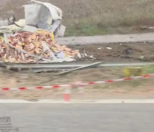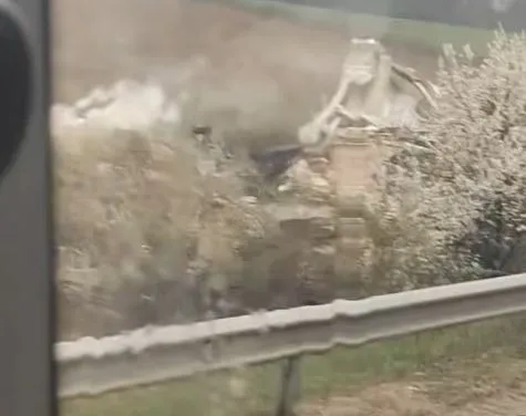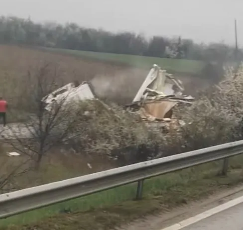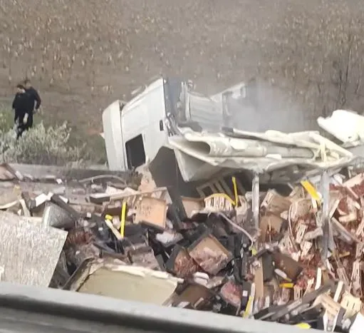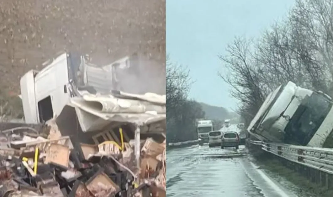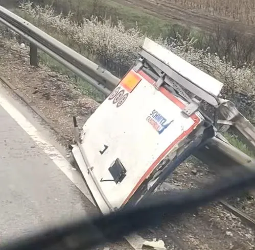 Товарна машина се е врязала в мантинела и после се е обърнала край пътя край Жеглица. Камионът буквално е неузнаваем след произшествието.