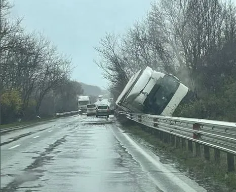 Друг пътен инцидент има край Крапчене. ТИР е "излетял" през мантинелата и се е обърнал в храстите. В катастрофата са участвали и коли. Няма данни за състоянието на шофьорите.