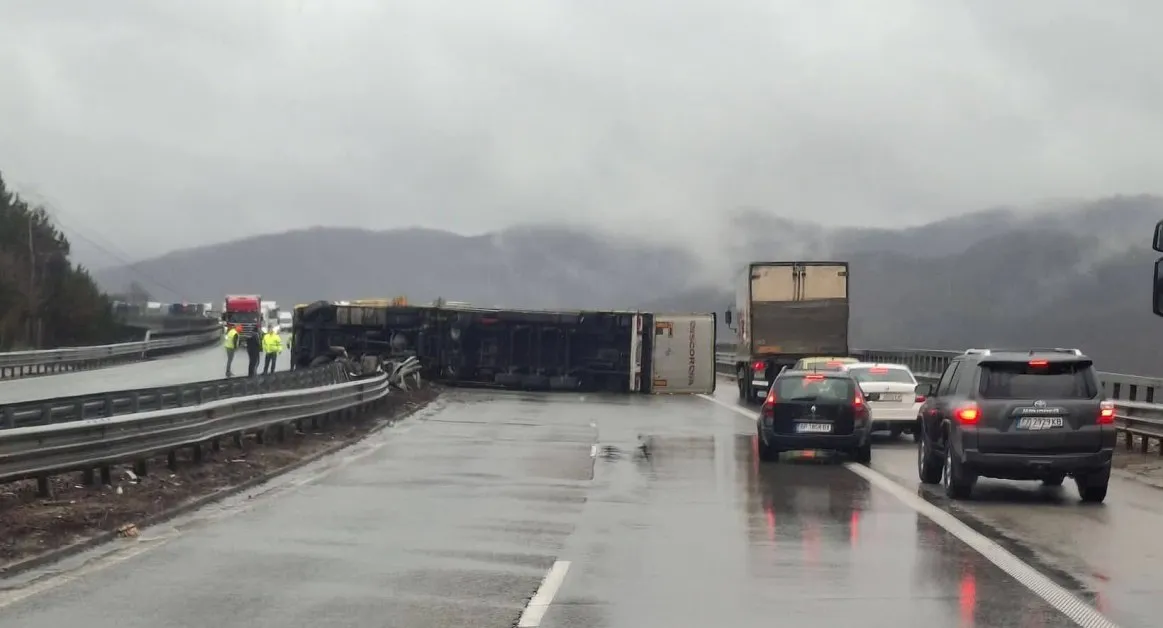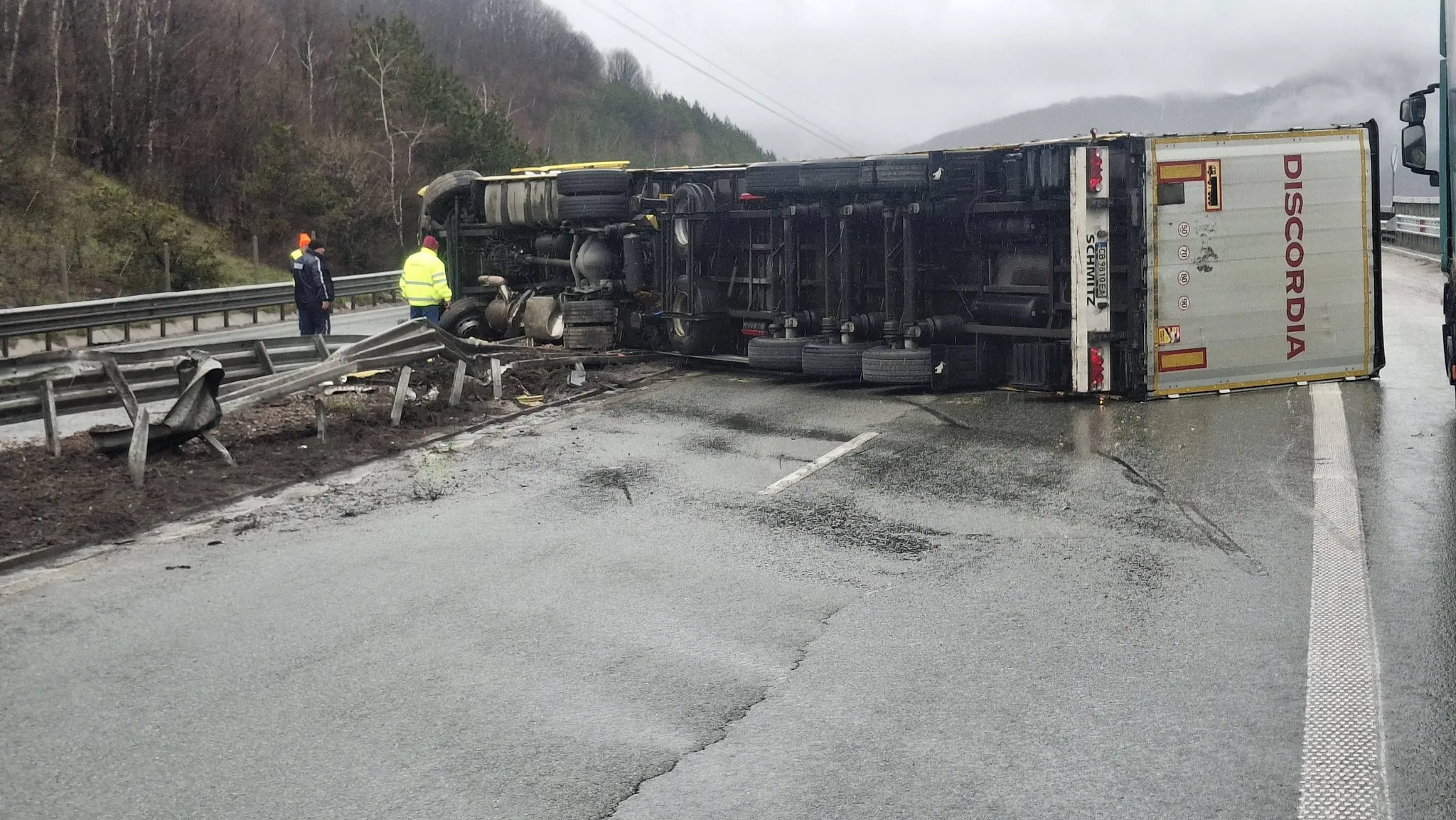 Катастрофа стана днес на автомагистрала „Хемус“. Тежкотоварен камион се е обърнал по средата на платното за движение.
