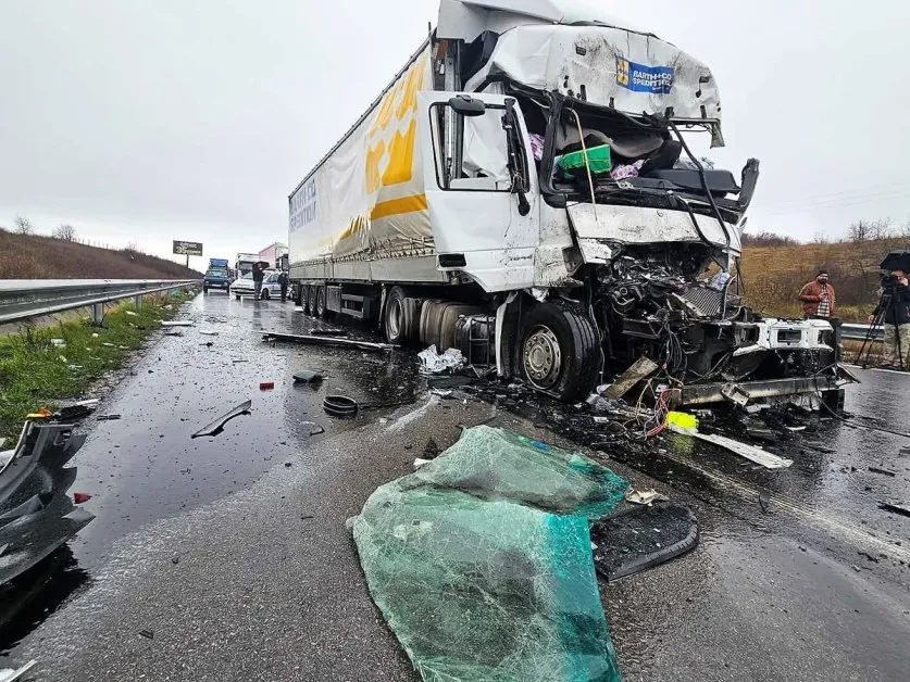 Водач на тежкотоварен е ударил отзад друг камион, който е бил спрял да изчаква на опашка. При инцидента е починал шофьорът на камиона, като той се е врязал в спрелите автомобили.