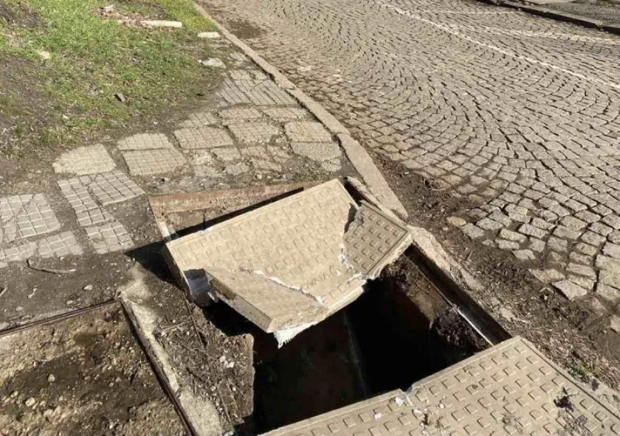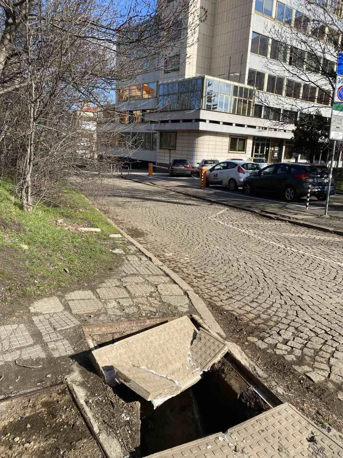 Капакът е пропаднал, част от него е счупена, а под него зее тъмна шахта. Мястото е оживено, ежедневно преминават десетки хора – включително възрастни и майки с деца.