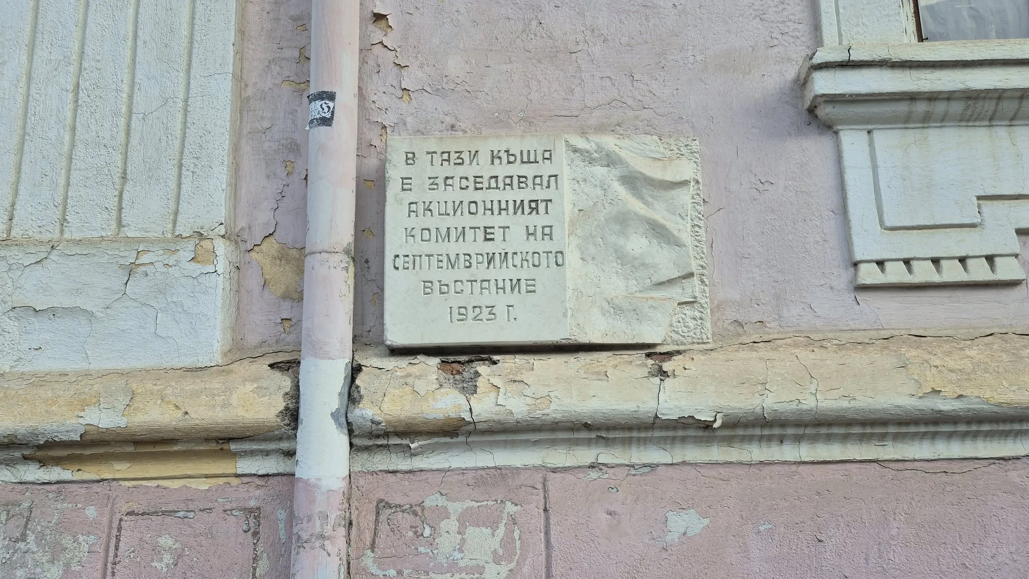 На фасадата още стои плочата: „В тази къща е заседавал акционният комитет на Септемврийското въстание – 1923 г.“ Стои – но под нея мазилката се рони. Символика, която боде очите: паметник на българската история, впилен в пукнатини.