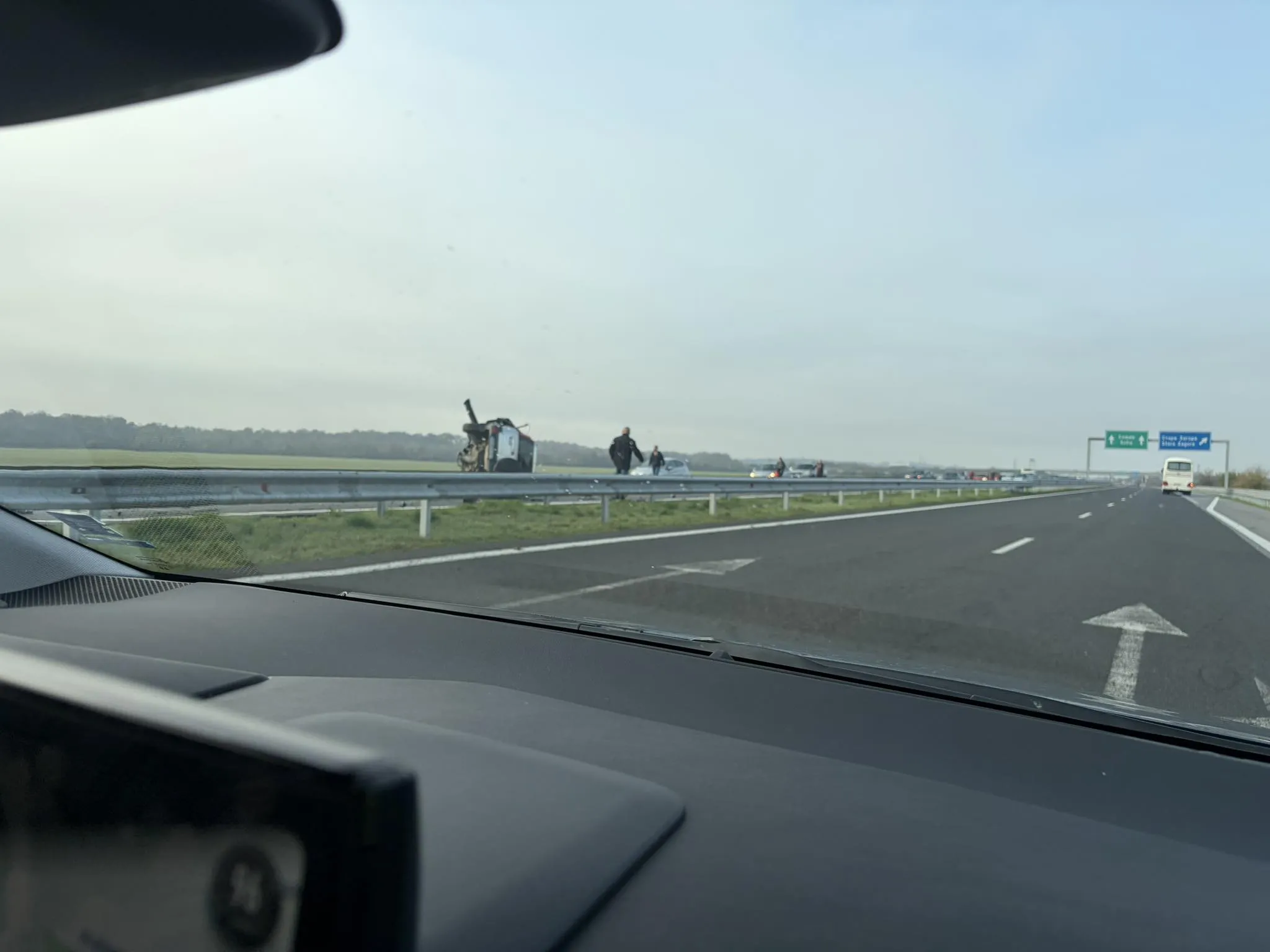 Бахчеванов сподели и снимка. На кадъра се вижда спрял в дясната лента на магистрала полицейски автомобил, който пренасочва трафика от леки автомобили през пътя Стара Загора - Хасково. Точно след "детелината" е и станало произшествието.