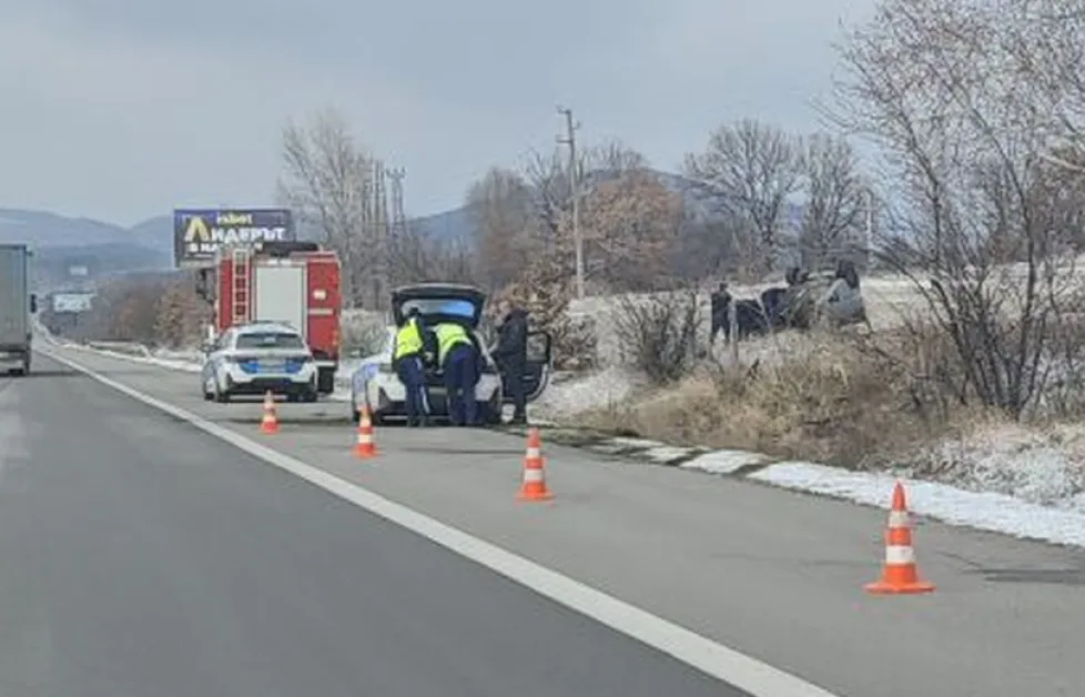 Лек автомобил се е озовал по таван извън платното за движение. На мястото са пристигнали екипи на пожарна и полиция.