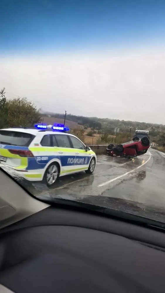 Кола се обърна по таван на мокрия път край село Вакарел. Инцидентът е станал на завой, където колата се е завъртяла и преобърнала, озовавайки се по таван на пътното платно.