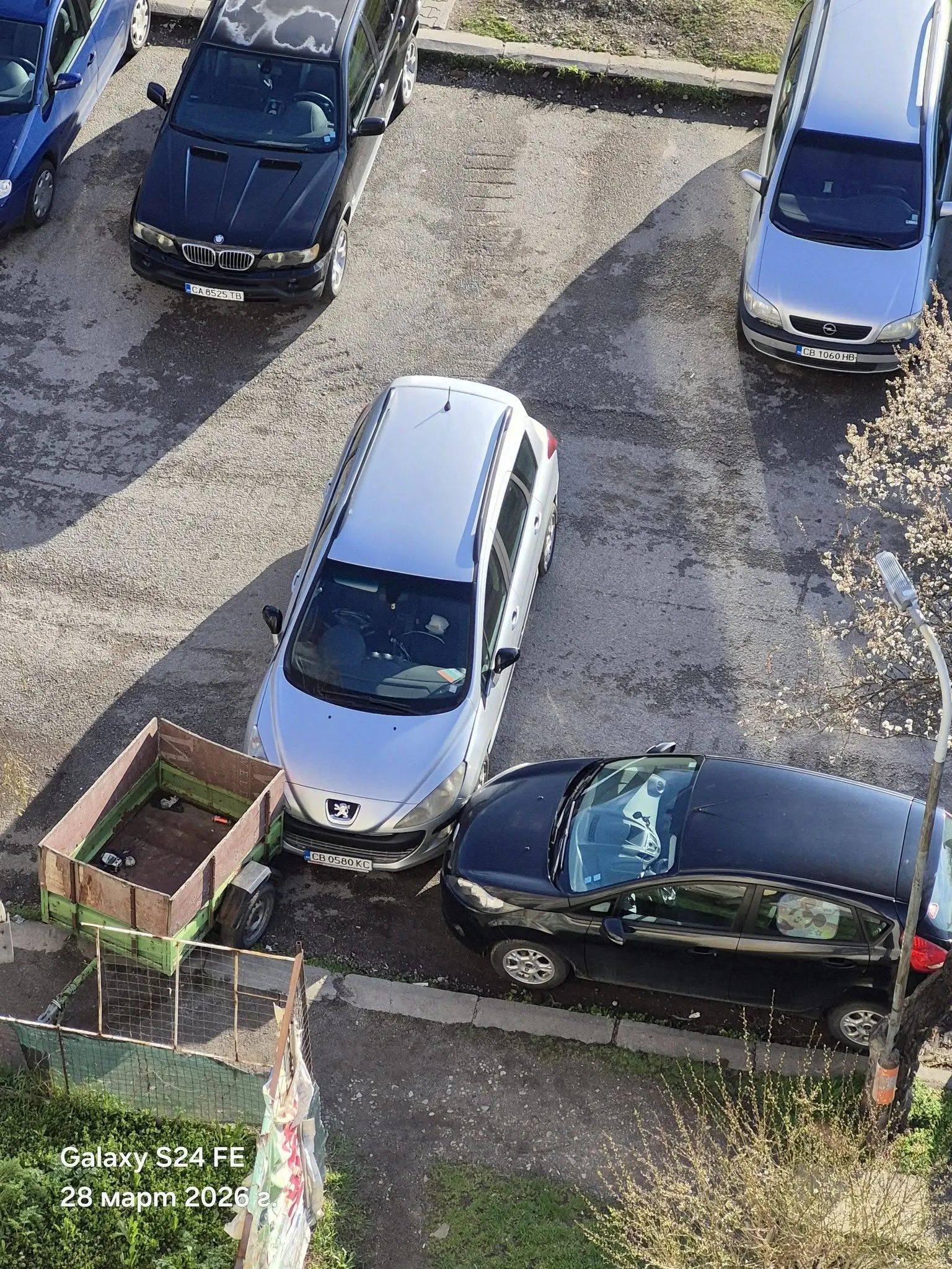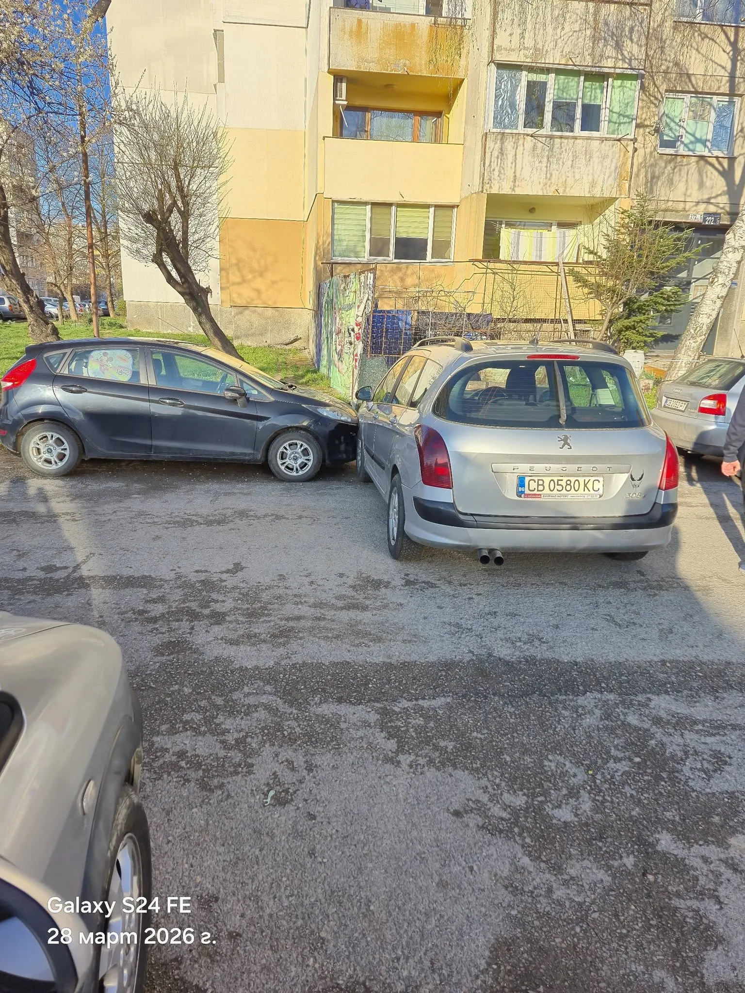 "Не е лошо да сe оставят колите на скорост или поне ръчна спирачка. Peugeot-то е тръгнало по наклона и е ударило фиестата", пише мъжът. Той илюстрира абсурдната засечка и със снимки.