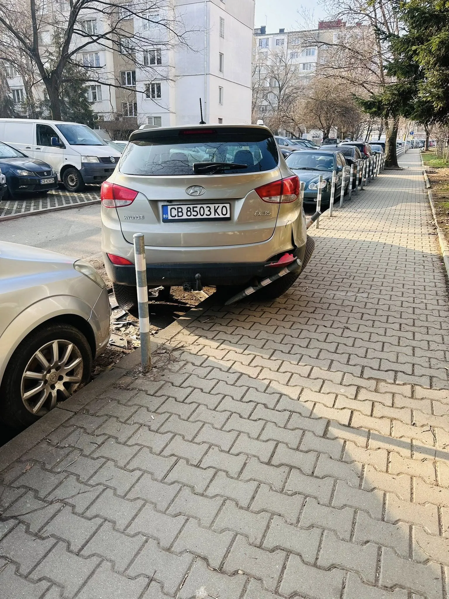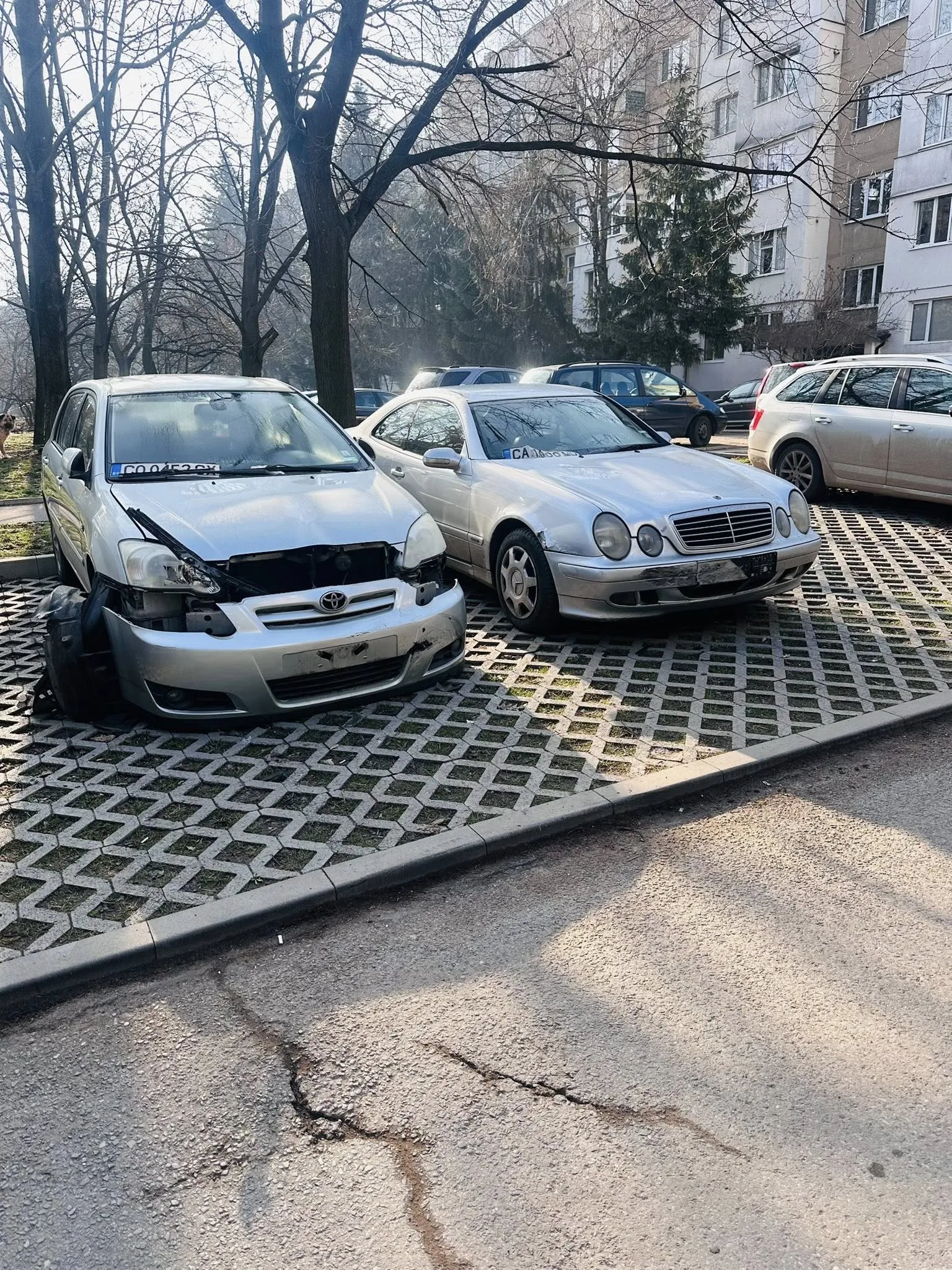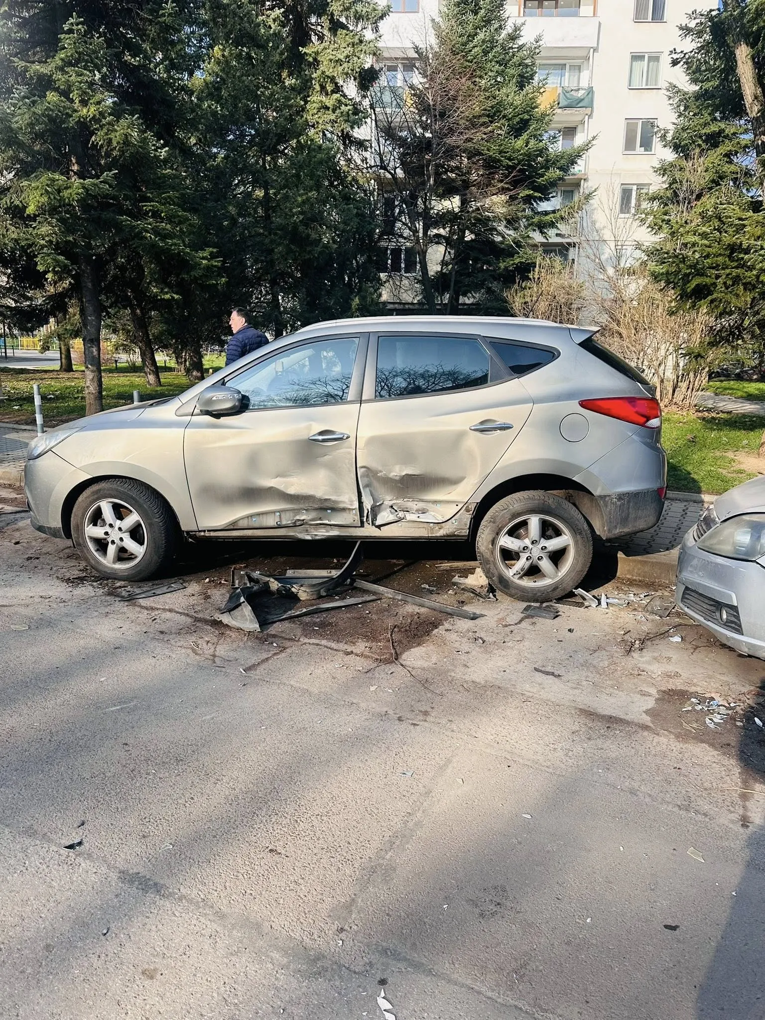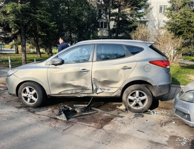 На кадрите се вижда силно ударен автомобил, смачкани врати и разпръснати части по пътя. Има щети и по други две паркирани коли.