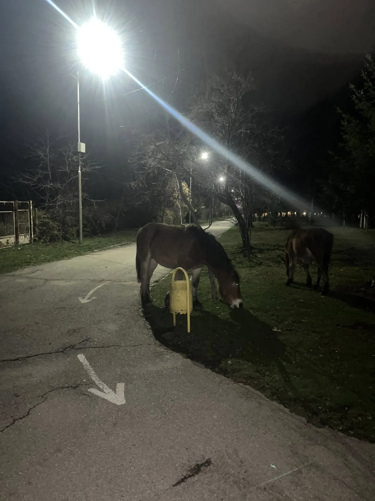 Жители на Самоков останаха изненадани от необичайни посетители в парк „Туристическата градина“ - няколко коня, които спокойно се разхождат сред алеите и пасат тревата, привличайки любопитни погледи.