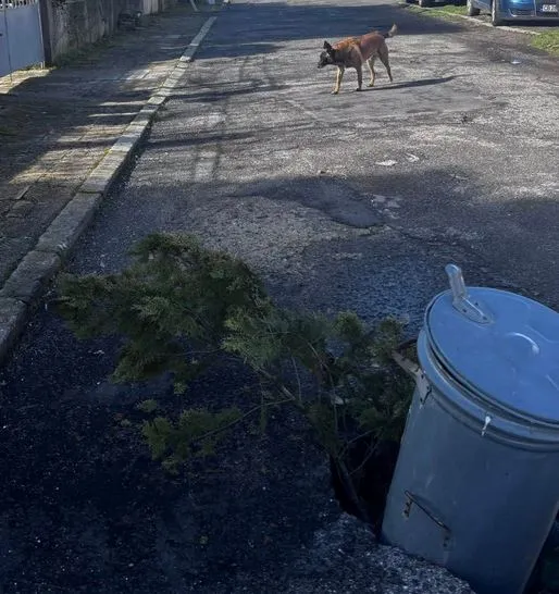 Фотографиите показват сериозна дупка в асфалта, която изглежда достатъчно дълбока, за да създаде риск както за автомобили, така и за преминаващи хора. Вместо стандартна сигнализация или ограждения, в кратера е поставен метален контейнер за боклук, превърнал се в импровизиран предупредителен знак. Любопитна подробност в кадъра е и куче, което сякаш с интерес наблюдава необичайната сцена.