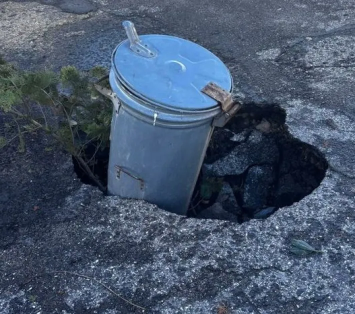 Любопитна и донякъде комична гледка предизвика реакции в социалните мрежи, след като дама сподели снимки на нестандартно „обезопасяване“ на опасен участък от пътя. На кадрите се вижда дълбок кратер, зейнал на асфалтова улица, в който е поставена кофа за смет – очевидно с цел да предупреждава водачи и пешеходци за опасността.