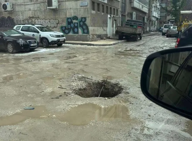 Гледката край блок „Найден Киров 1“ напомня апокалиптичен пейзаж, показват кадри, разпространени от Калоян Петров. Кал, а не асфалт, коли, накацали в прахта, и огромна дупка посредата на платното – това виждаме на единия кадър, а на другия автомобил е пропаднал в зейнал кратер.
