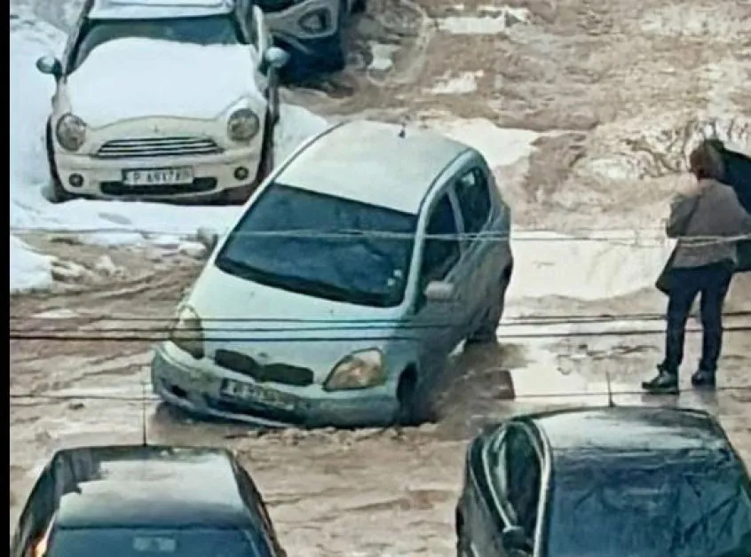 Гледката край блок „Найден Киров 1“ напомня апокалиптичен пейзаж, показват кадри, разпространени от Калоян Петров. Кал, а не асфалт, коли, накацали в прахта, и огромна дупка посредата на платното – това виждаме на единия кадър, а на другия автомобил е пропаднал в зейнал кратер.