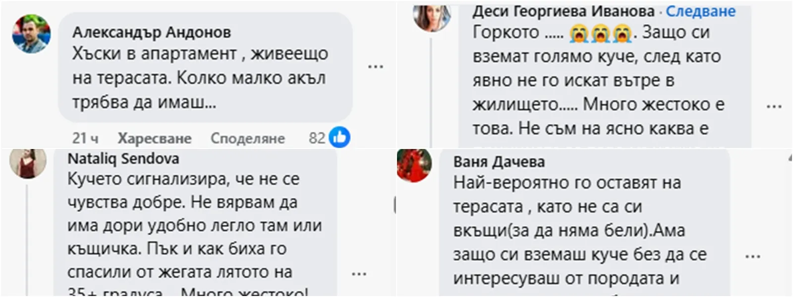 Авторът на поста, пожелал анонимност, споделя, че животното е оставяно на терасата „зиме и лете, ден и нощ“ и че непрестанното му виене и лай правят живота на съседите непоносим.