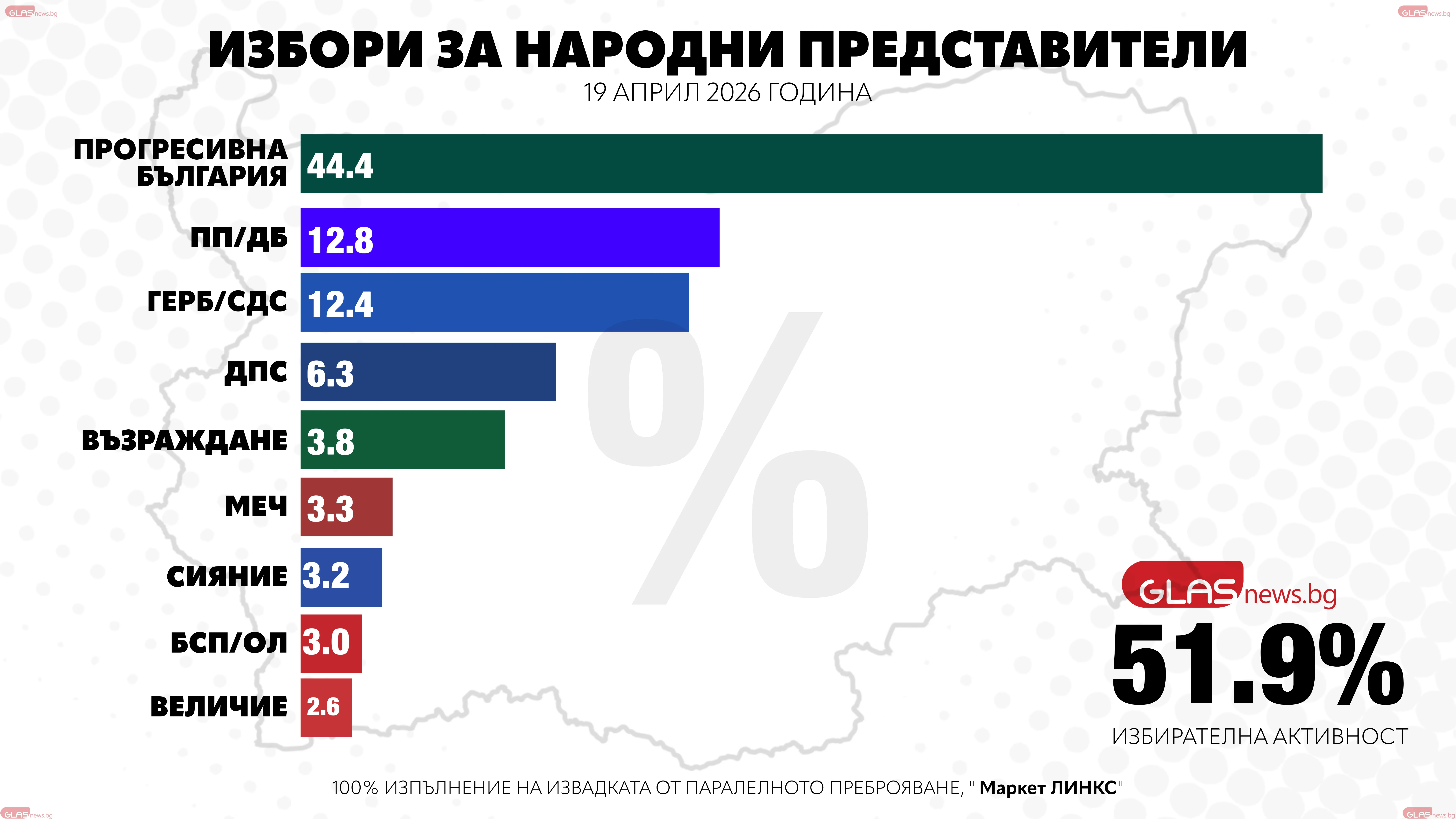 Четири партии влизат в 52-ото Народно събрание, сочат данните при 100% паралелно преброяване на социологическата агенция "Маркет ЛИНКС". "БСП-Обединена левица" и "Възраждане" не успяват да прескочат 4-процентната бариера съответно с 3% и 3,8% подкрепа.
