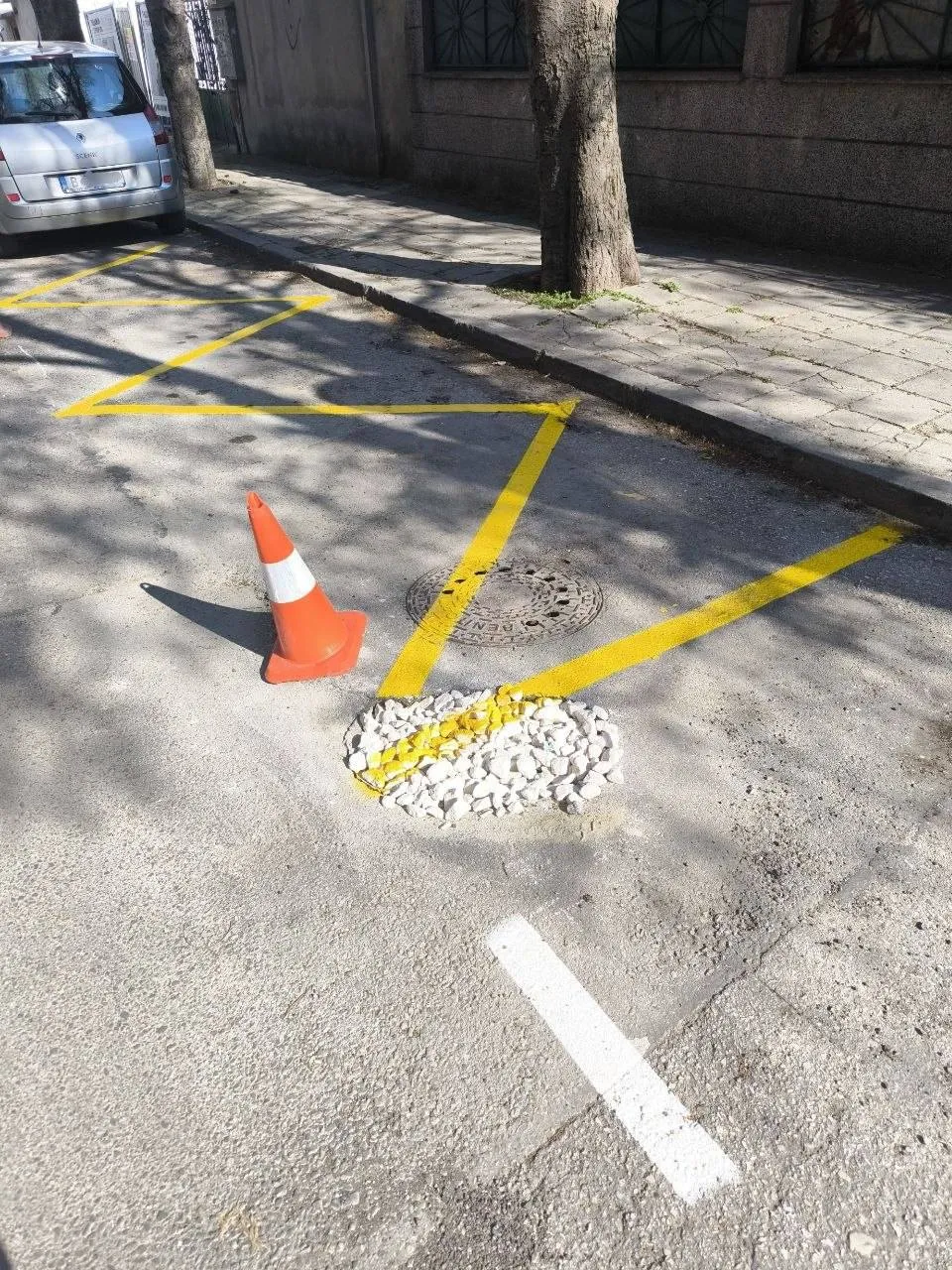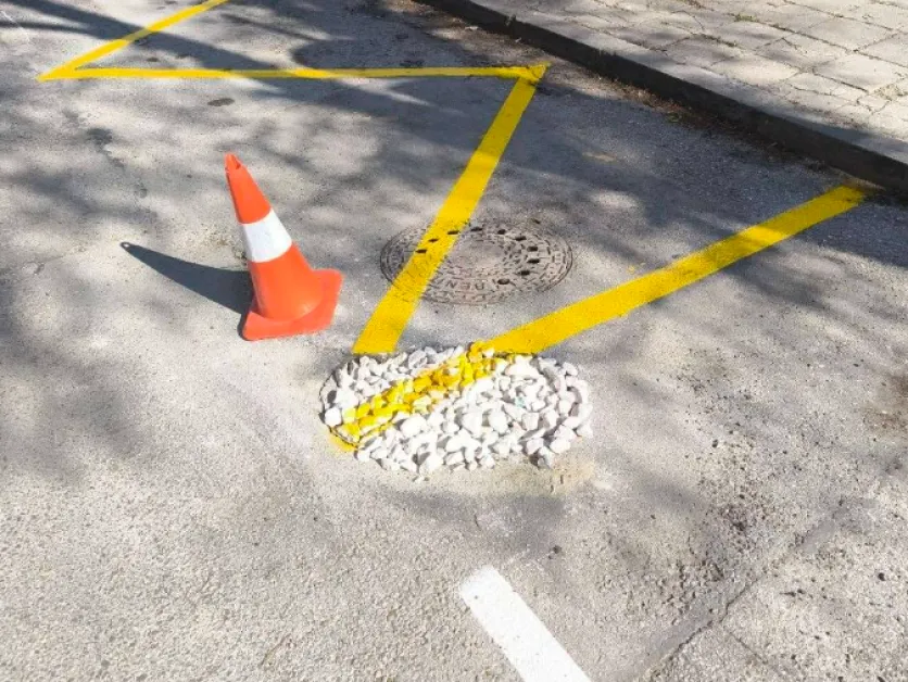 На снимката ясно се виждат жълти линии, очертаващи паркоместа, които минават директно през компрометиран участък от настилката. В центъра на едно от местата дори има дупка, запълнена с чакъл, а до нея е поставен сигнален конус.