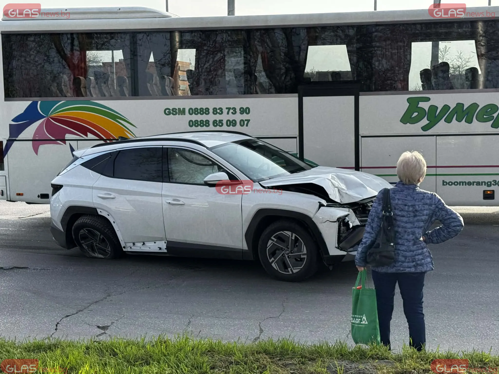 По щетите на белия автомобил личи, че ударът е бил сериозен, но концентриран основно в предната част: предният капак е силно нагънат и повдигнат, типично за директен челен удар. Виждат се разкъсани пластмасови елементи и открити вътрешни части, еърбеците са се отворили.