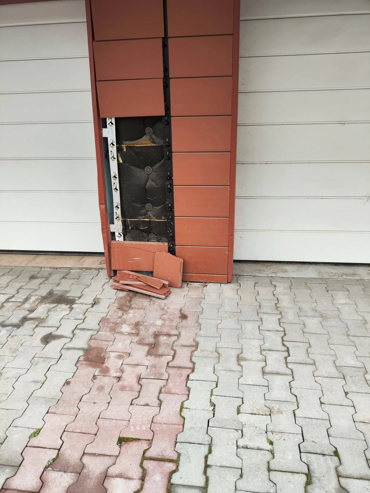 @glasnews Фасадна облицовка на колона до гаражна врата във Велико Търново е сериозно увредена, като част от панелите са паднали, а под тях се вижда оголената топлоизолация и носещата конструкция. Оказва се, че виновникът за това е момиче зад волана, което се удря в колоната и после потегля. Повече по темата ще намерите на glasnews.bg #българия #новини #fyp #foryoupage #великотърново ♬ Rockin - Chris Alan Lee