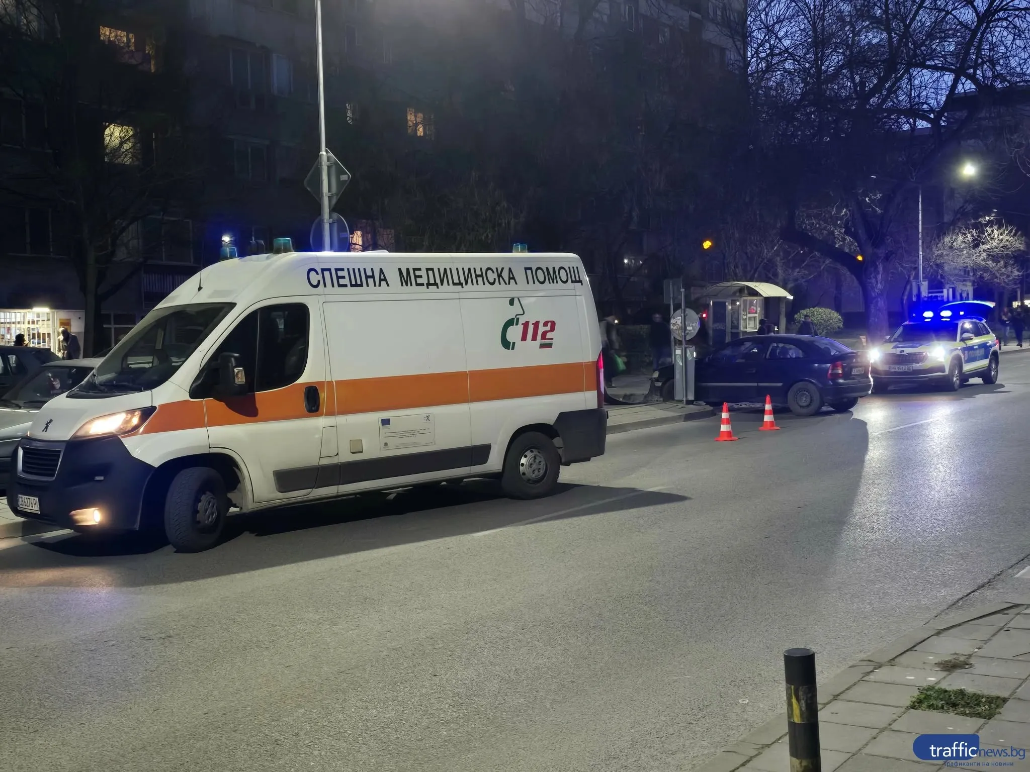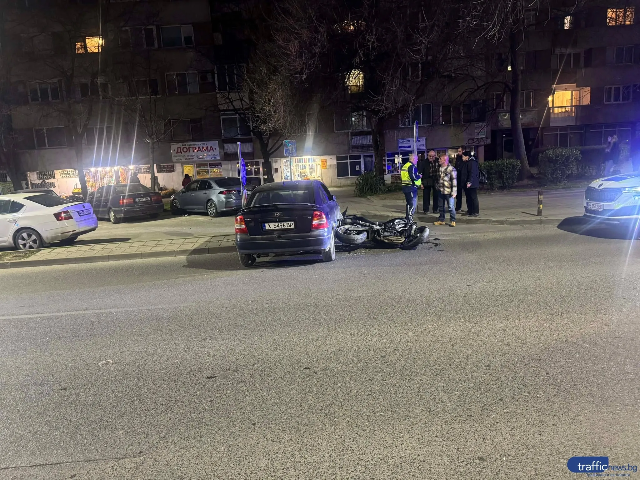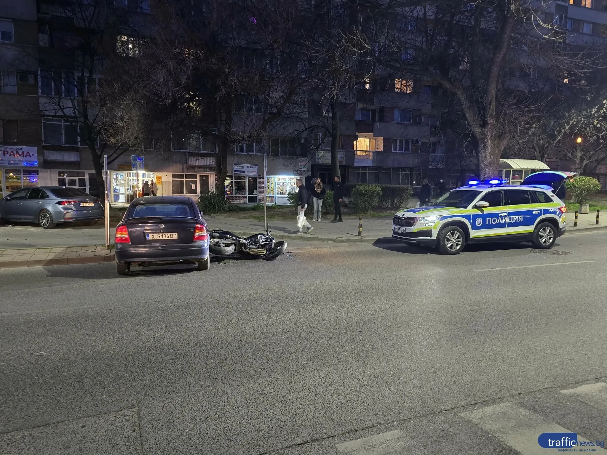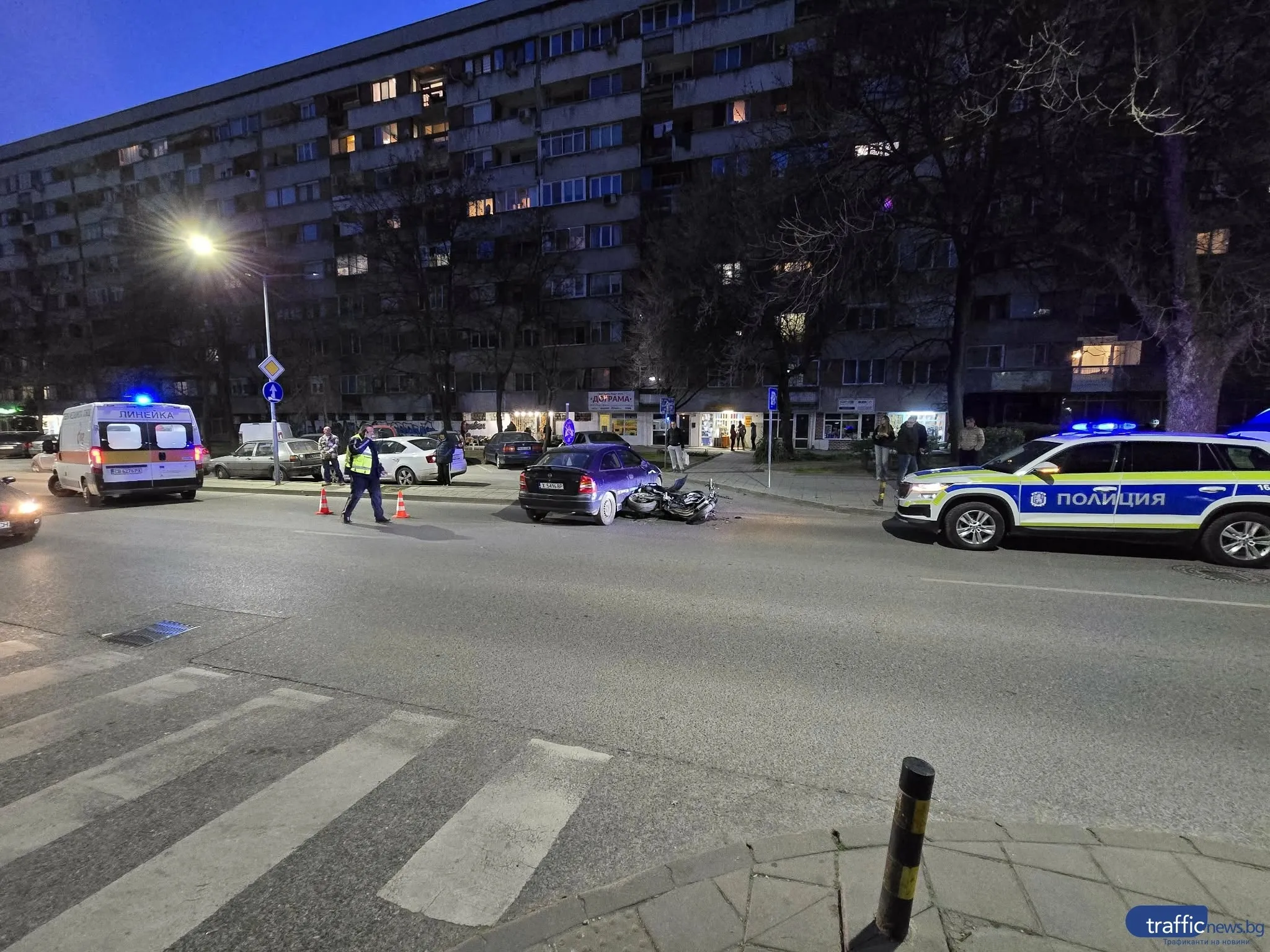 На място пристигат линейка и две полицейски коли, като мотористът е бил настанен в линейката и тя е тръгнала към болницата.