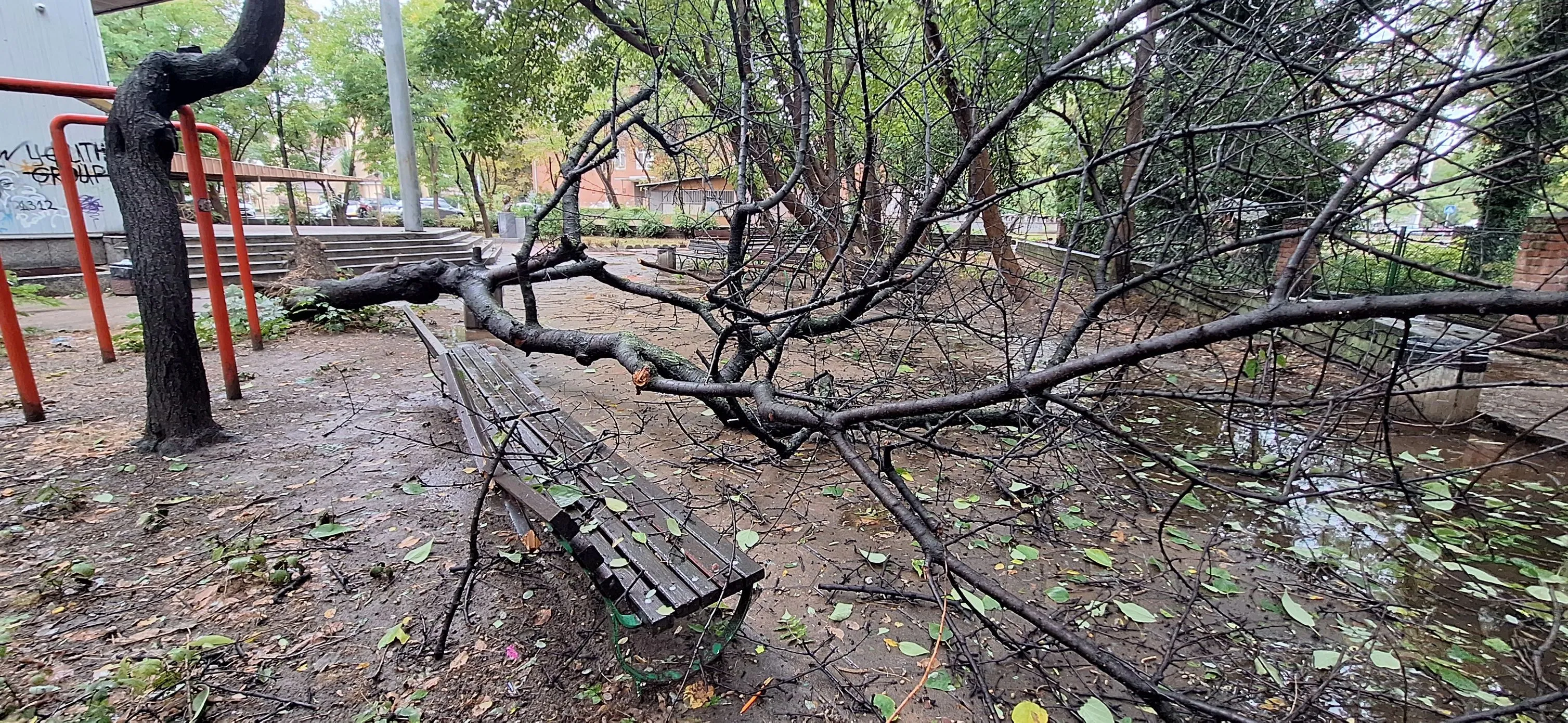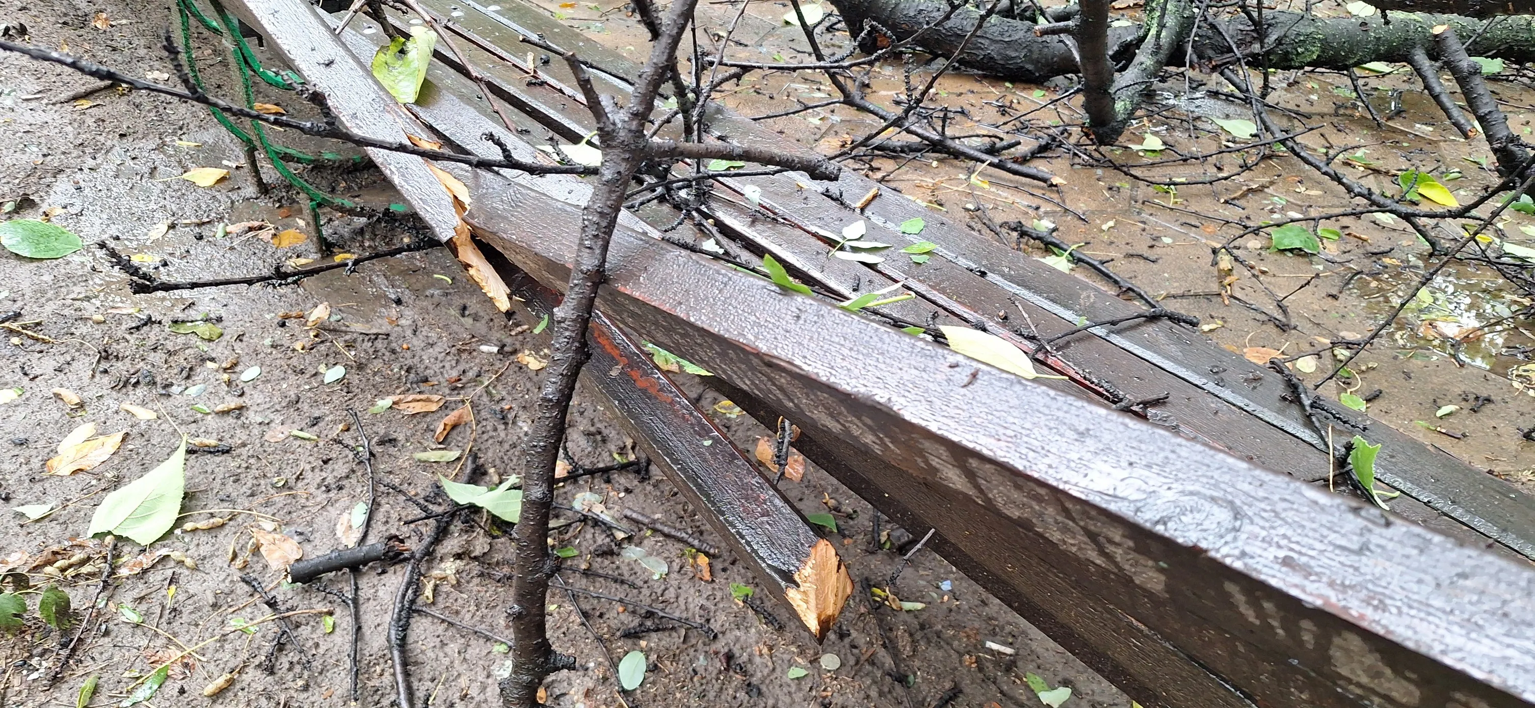 Поваленото дърво е пречупило пейката и преградило пътеката. Мястото е популярно сред живеещите в района и често използвано за отдих.