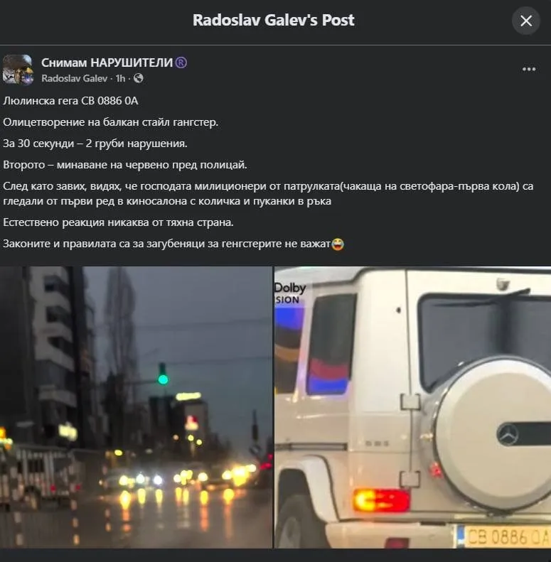 Вместо да извърши позволения завой, шофьорът рязко се престроил и завил надясно, изпреварвайки чакащите автомобили и създавайки предпоставка за пътнотранспортно произшествие. Очевидецът твърди, че в рамките на кратко време са били извършени две груби нарушения, едното от които – преминаване на червен сигнал на светофара.