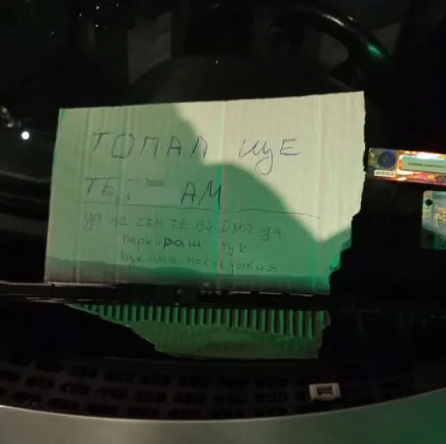 Самата бележка, написана върху парче картон, съдържа заплашителен текст, свързан с начина на паркиране. Макар и правописът да оставя място за тълкуване, посланието е ясно – недоволство, гарнирано с агресивен тон, вместо разговор или сигнал до компетентните органи.