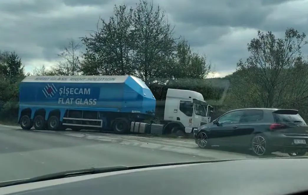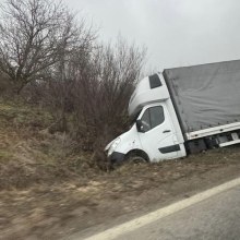 Камион е излязъл извън пътното платно след сблъсък с кола. Към момента не е ясно дали има пострадали хора.