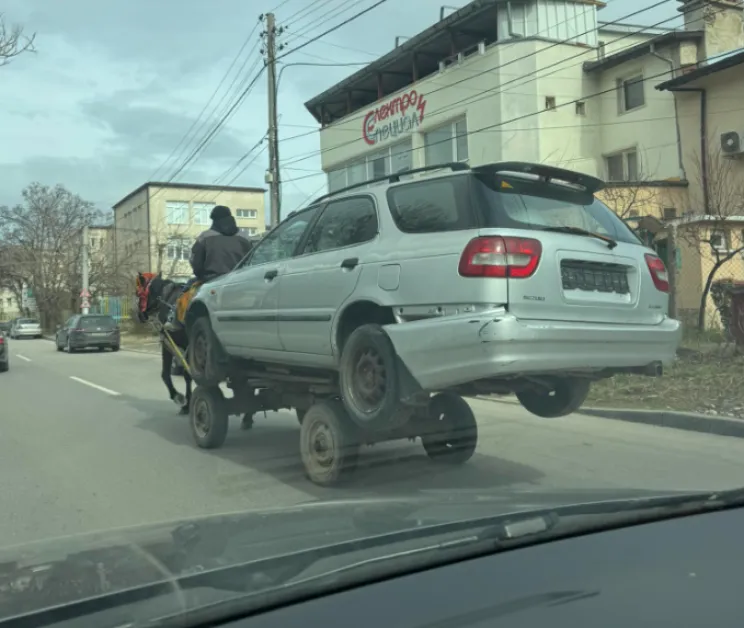 На кадъра се вижда лек автомобил, качен върху каруца, теглена от кон. Возилото, натоварено върху платформата, изглежда повредено – със следи от удари по задната част. Цялата ситуация се разиграва в градска среда, сред сгради и преминаващ трафик.