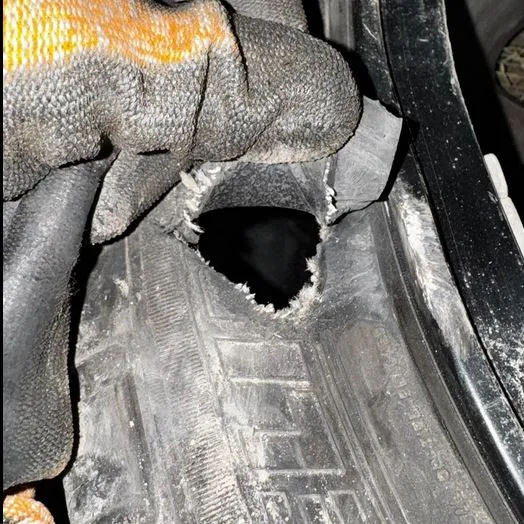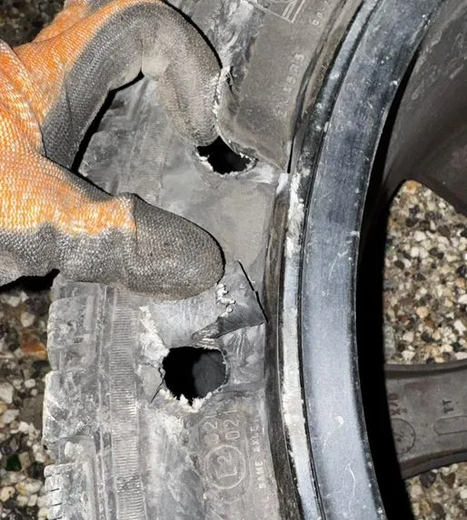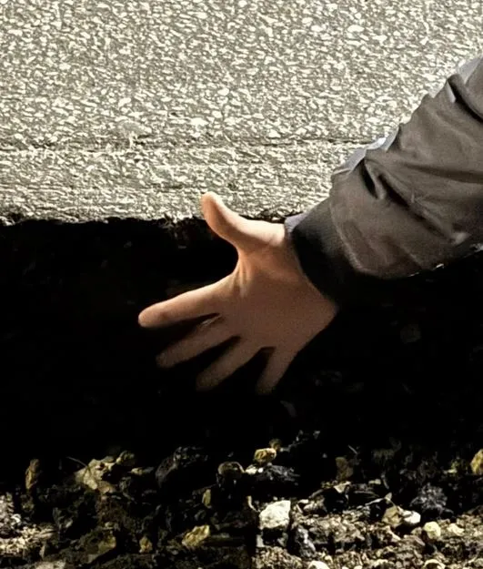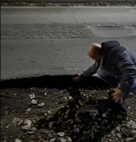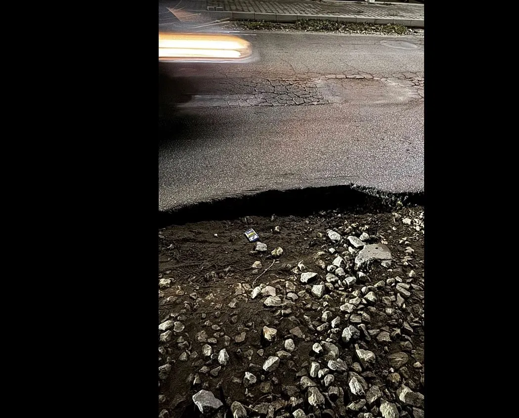 Той илюстрира ситуацията и със снимки, на които се вижда спуканата гума и зеещият кратер, който е с дълбочина на педята му.