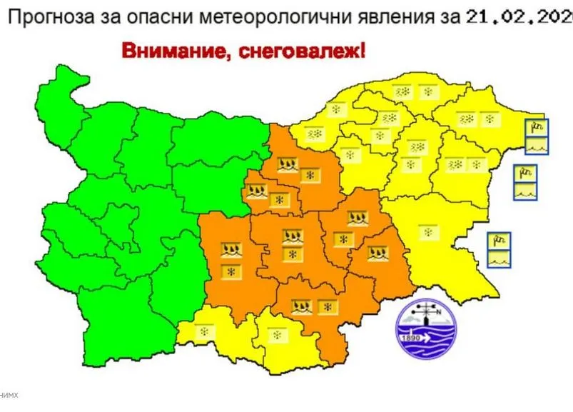 Жълт код за опасно време е в сила за 11 области. Значителни валежи от дъжд, ще преминават в сняг. В планинските райони ще има условия за виелици и навявания. На много места има опасност и от поледици. По Черноморието ще силен вятър с пориви 14-17 m/s. Жълтия код е в сила за областите Добрич, Варна, Бургас, Силистра, Разград, Шумен, Търговище, Русе, Плевен, Ловеч и Пазарджик.