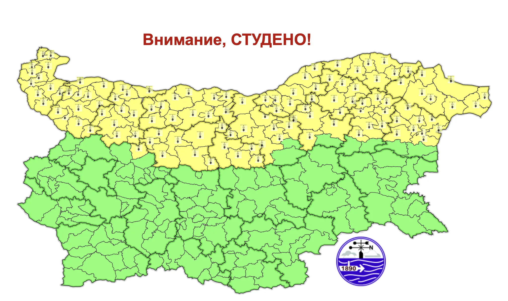 Предупреждението за студено време и отрицателни температури е в сила за областите Варна, Велико Търново, Видин, Враца, Габрово, Добрич, Ловеч, Монтана, Плевен, Разград, Русе, Силистра, Търговище и Шумен. За област Добрич предупреждението е и за силен северен вятър в крайните източни райони.