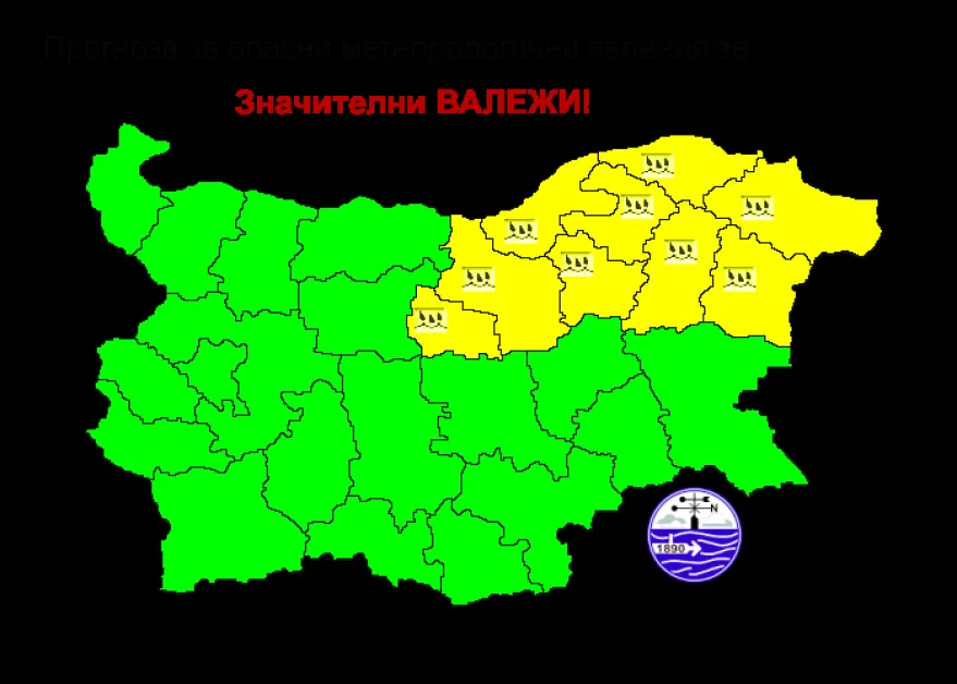 Жълт код за значителни валежи е обявен за 9 области в централна и Североизточна България утре. Предупреждението важи за Габрово, Велико Търново, Русе, Разград, Търговище, Шумен, Силистра, Варна и Добрич.