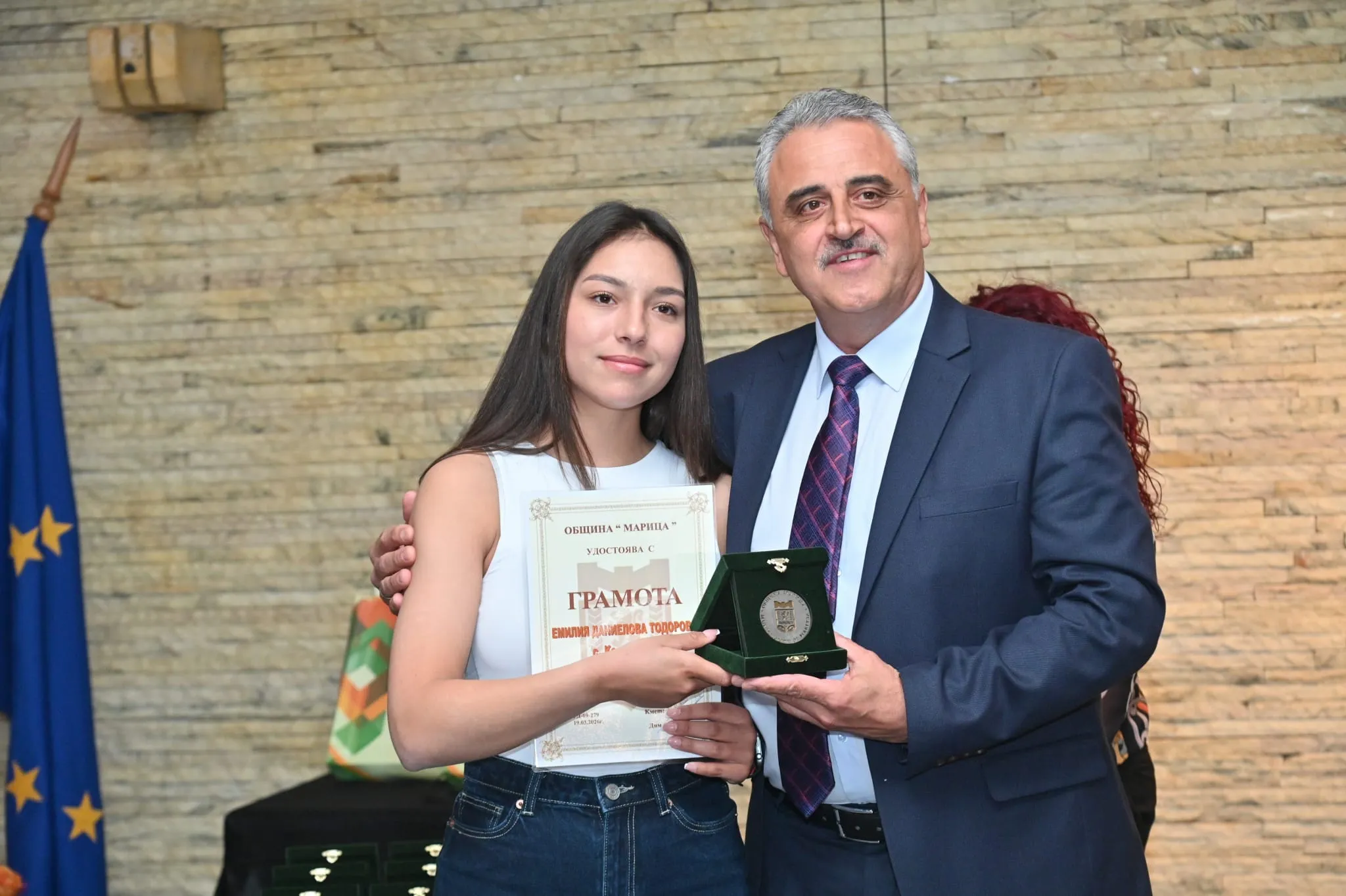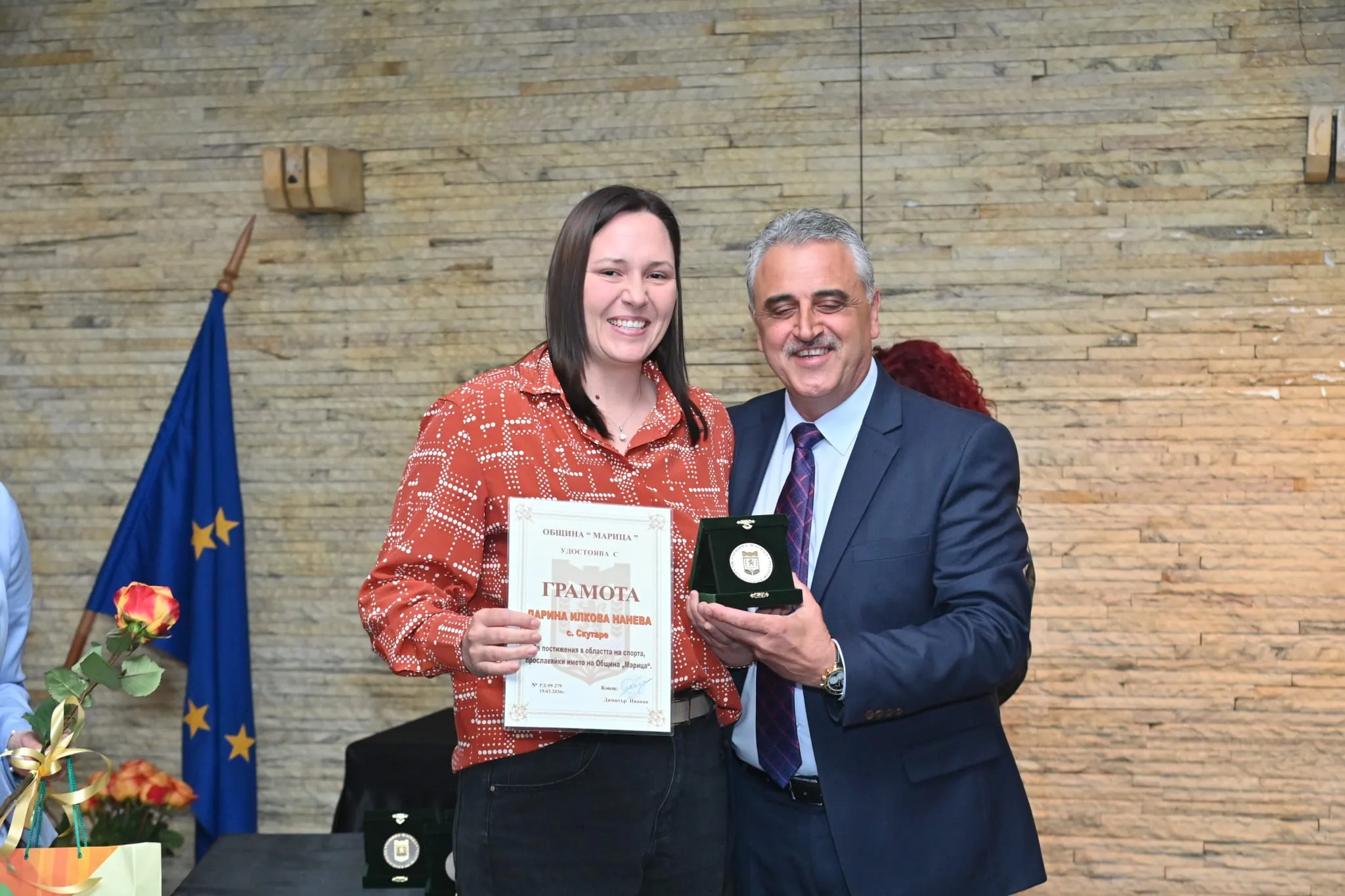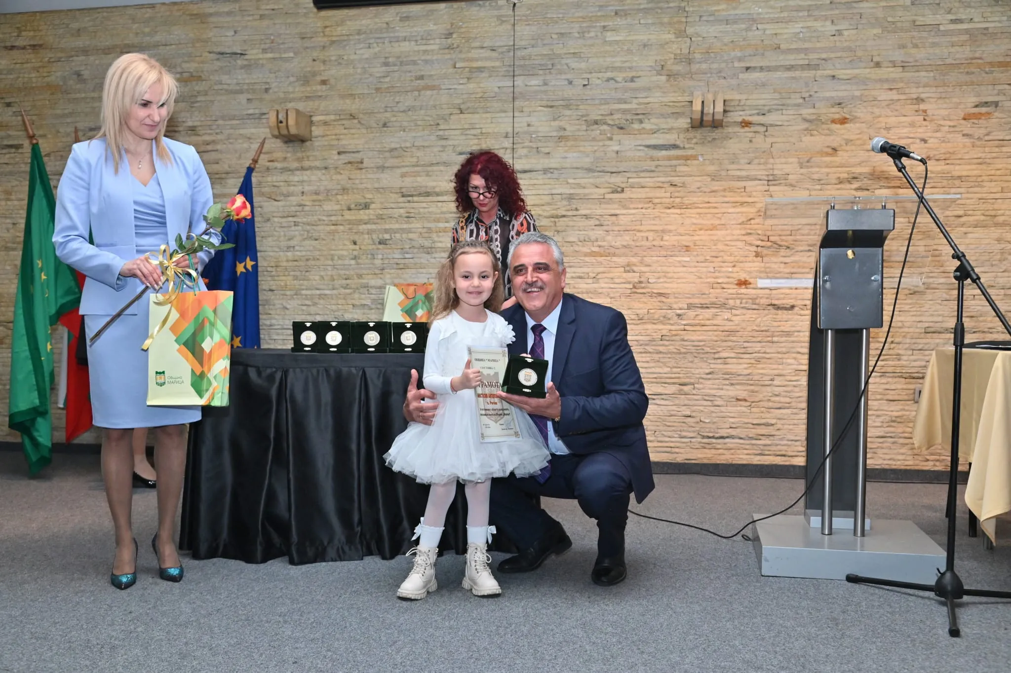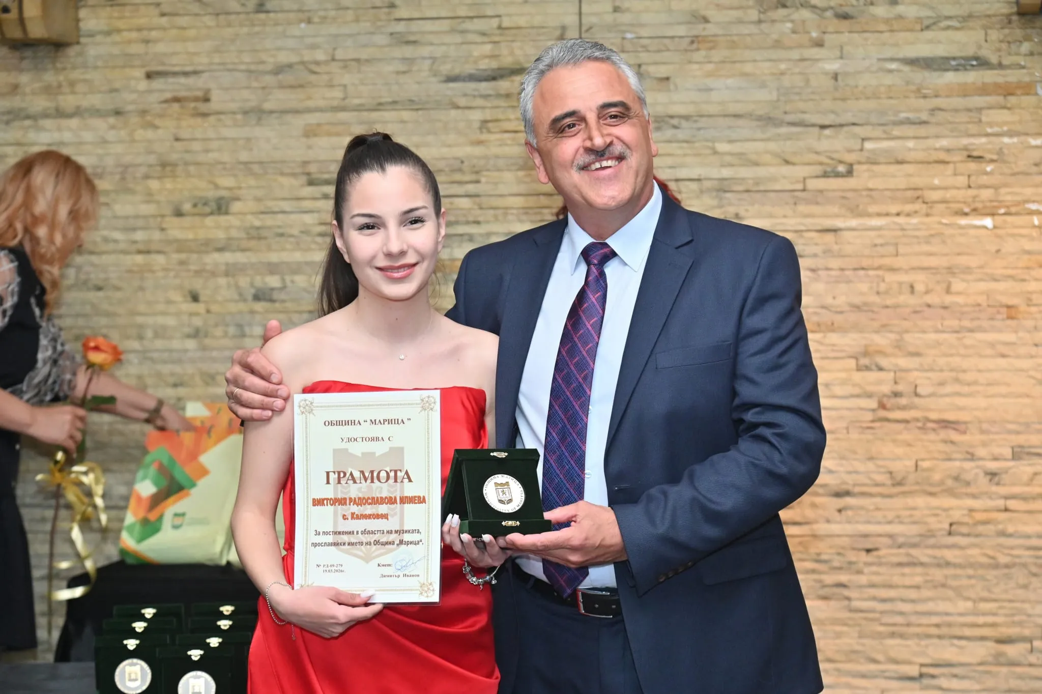 „Тези деца са гордостта на общината. Те показват, че когато има труд, подкрепа и вяра, резултатите не закъсняват. Наш дълг е да им създаваме условия да се развиват и да остават тук – в своя роден край", подчерта той. Иванов допълни, че инвестициите в младите хора са основен приоритет на местната власт. „Вече повече от десетилетие работим последователно за модерни училища, детски градини и спортна инфраструктура. Подкрепяме талантите, защото вярваме, че бъдещето на общината е в техните ръце", заяви Димитър Иванов и акцентира върху цялостното развитие на общината, припомняйки, че над 100 км пътна инфраструктура са обновени, като са привлечени инвеститори и са създадени работни места. „Развиваме индустриалната зона и подготвяме кадри за нея, защото искаме младите хора да имат реализация тук. Работим активно за по-чиста и зелена среда – с инвестиции в екотехника, кампании за разделно събиране и разширяване на зелените площи. Амбицията ни е ясна – Марица да бъде модерна, устойчива, привлекателна и първата въглеродно-неутрална община в България", заяви в емоционалното си слово Иванов.
