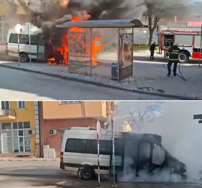 Кадрите показват изключително сериозен инцидент – машината е обхваната от огромни пламъци в непосредствена близост до автобусна спирка. Огънят бързо се разраства, а гъст черен дим се издига над района, докато на място пристигат екипи на пожарната, които започват гасителни действия.