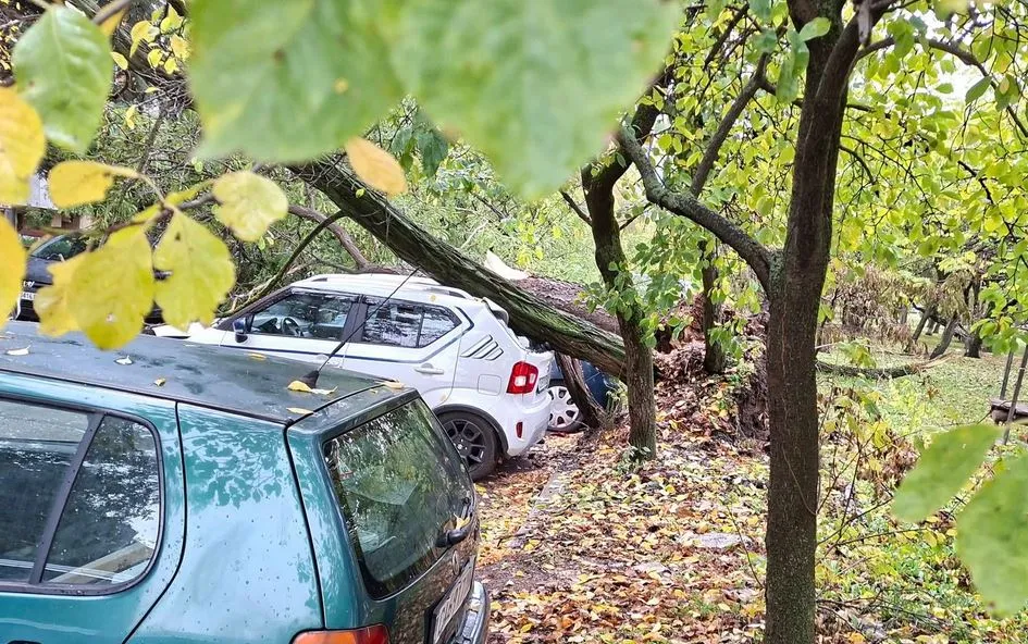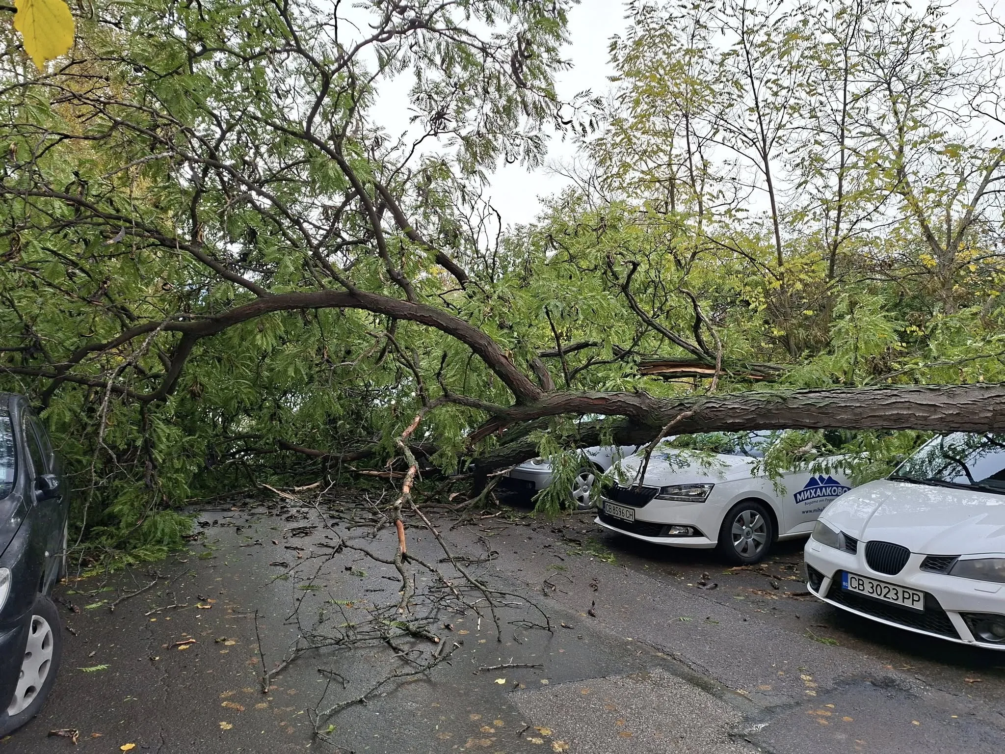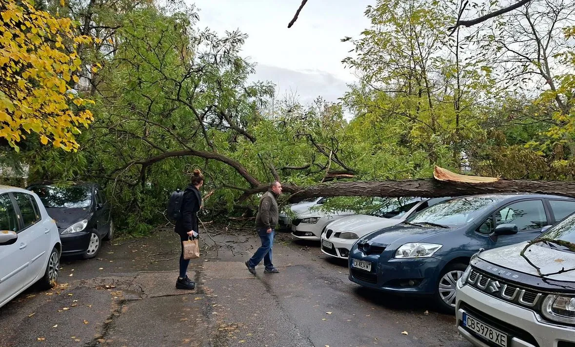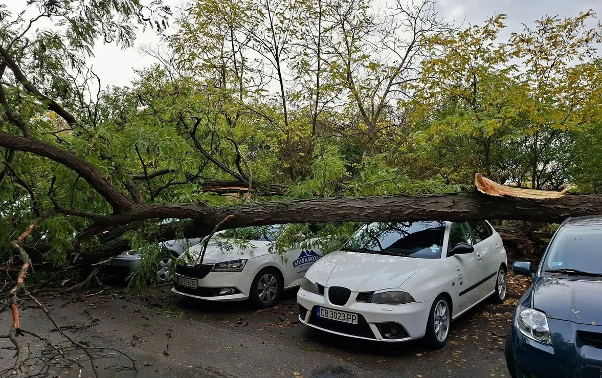 Инцидентът е станал пред блок 102 в квартал "Мусагеница", между входове 5 и 6. На разпространените кадри се вижда ствола, който е паднал върху няколко няколко автомобила.