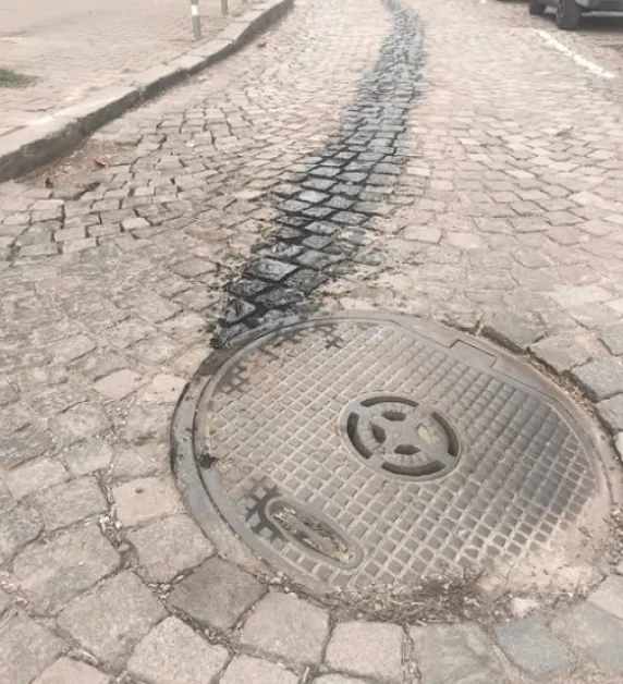 По думите му случаят е от ул. „Виктор Юго“, на около 50 метра от Орлов мост. На кадъра се вижда следа от разлято двигателно масло, която минава по паважа и води до шахта с надигнат капак.