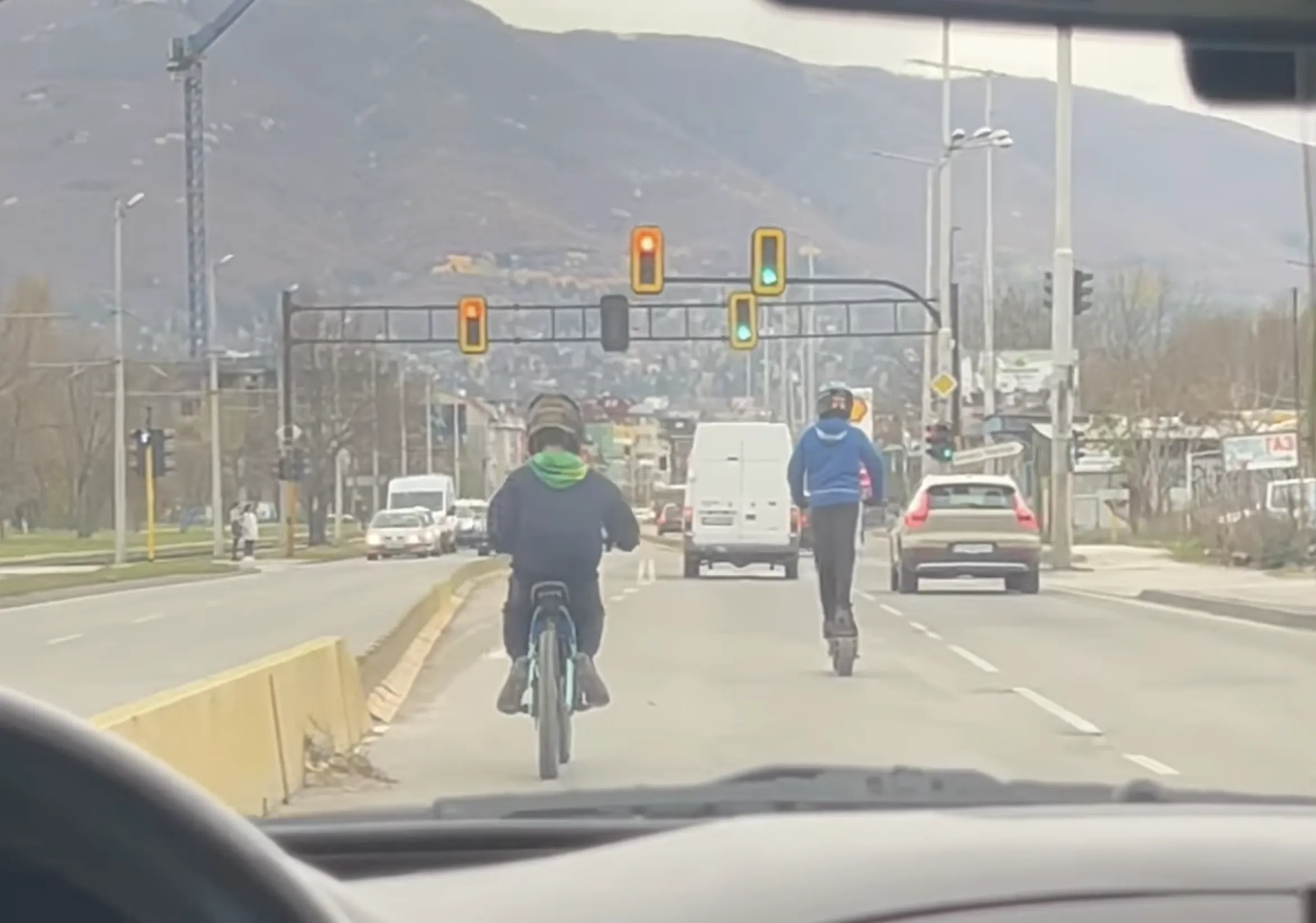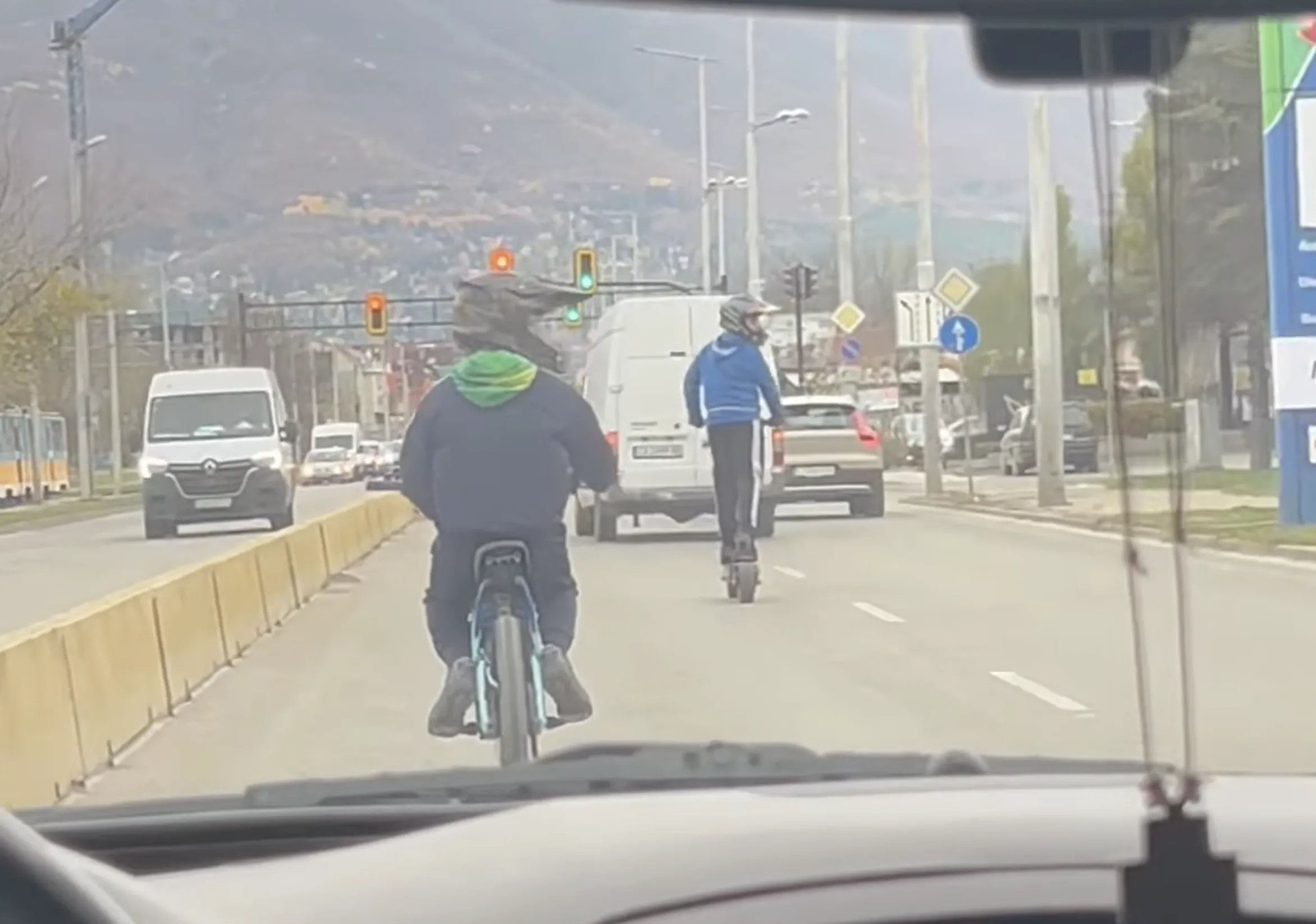 На споделеното видео се вижда как две лица - видимо непълнолетни, карат електрическо колело и електрическа тротинетка по платно на столичен булевард. Не стана ясно как е точното име на улицата.