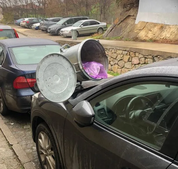 Войната за паркоместа по родните улици продължава да ражда нови форми на взаимодействие между обитателите на градската среда. Когато място липсва,здравият разум е в отпуск, а търпението – изчерпано, казанът за смет се превръща в универсално средство за комуникация.