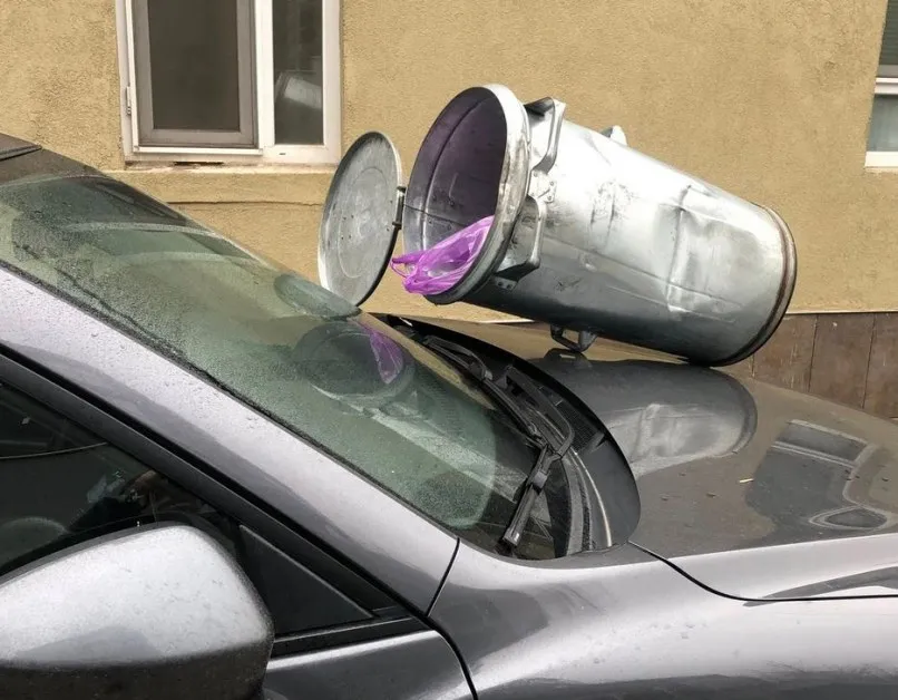 На улица „Никола Петков“ се е появила любопитна композиция – върху капака на паркиран автомобил гордо се мъдри… казан за смет. Инсталацията е едновременно минималистична и многозначителна, а посланието ѝ – ясно дори без превод.