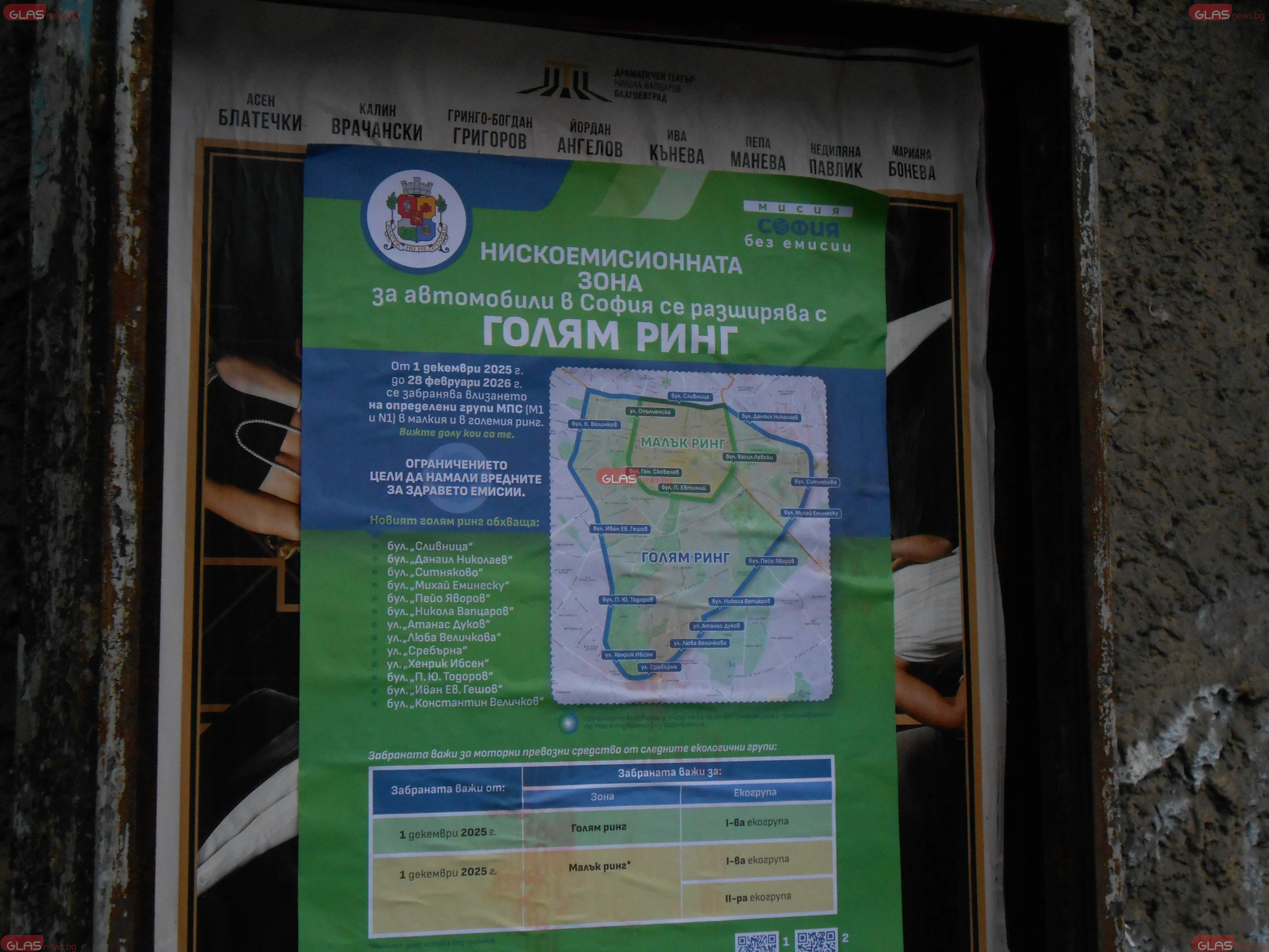 От днес - 1 декември, до 26 февруари 2026 година, в София ще действат два нискоемисионни ринга - малък и голям, в които е забранено влизането на автомобили от първа и втора еко категория.