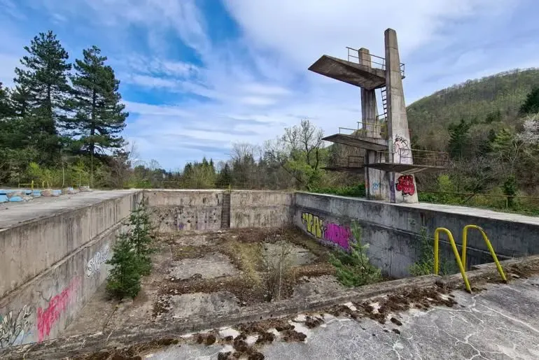 Днес картината е коренно различна. Огромните открити басейни пустеят – напукани бетонни стени, обрасли с растителност участъци и графити по кулата за скокове напомнят за отминалото време. Някога оживеното пространство сега е безлюдно, а тишината се нарушава единствено от вятъра.