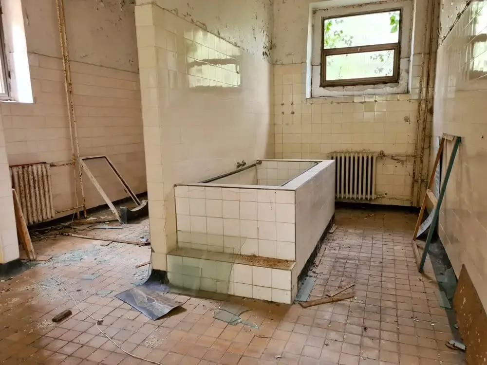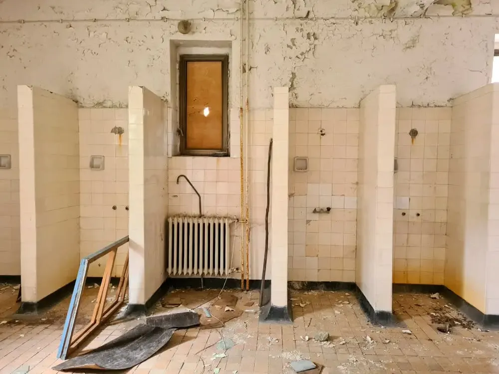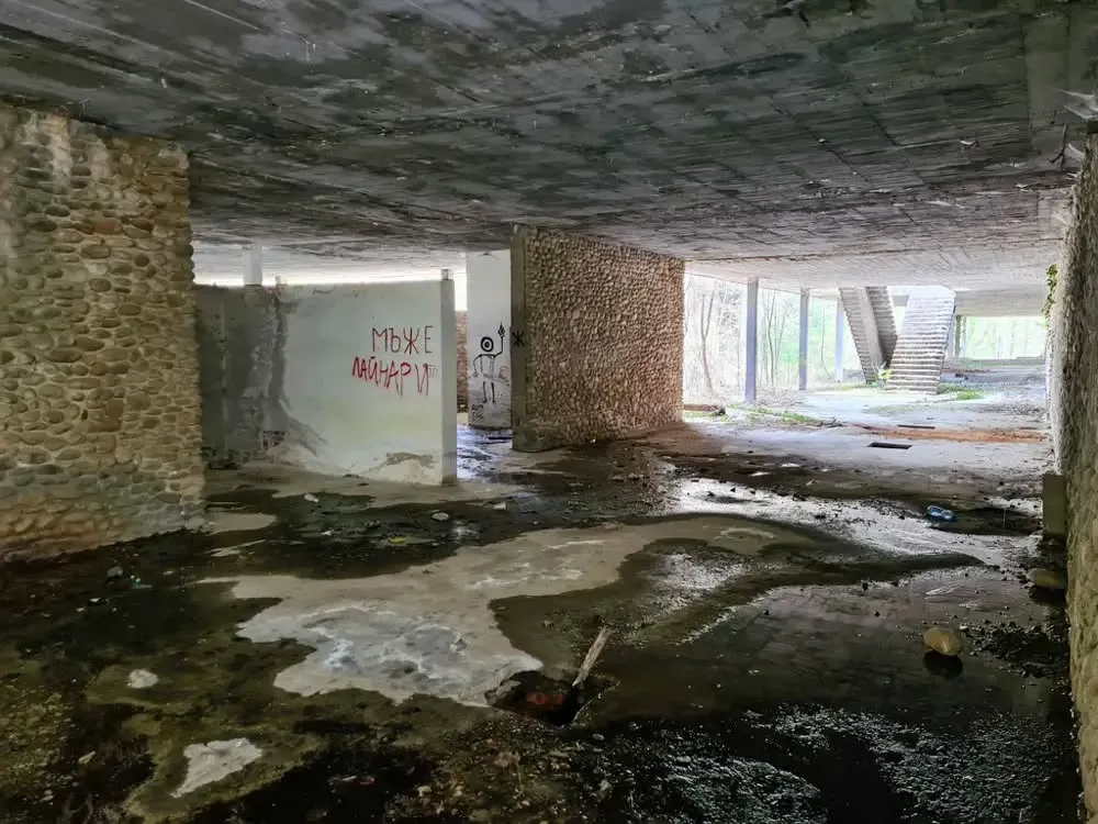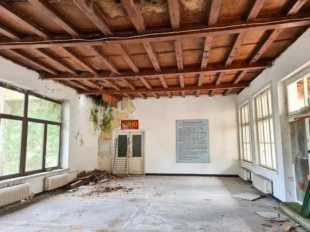 Вътрешността на сградата е в още по-тежко състояние. Коридорите са влажни и потънали в мрак, по пода има локви и отпадъци. Плочките в баните са изпочупени, мазилката пада от стените, а оборудването отдавна липсва. Съблекалните и санитарните помещения са напълно занемарени, а прозорците са счупени или заковани.