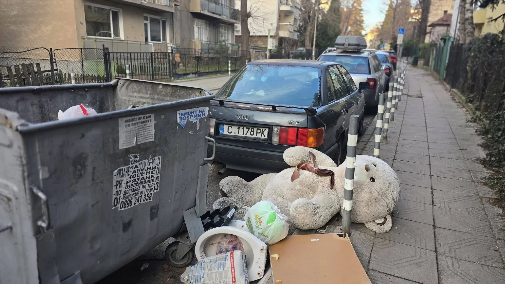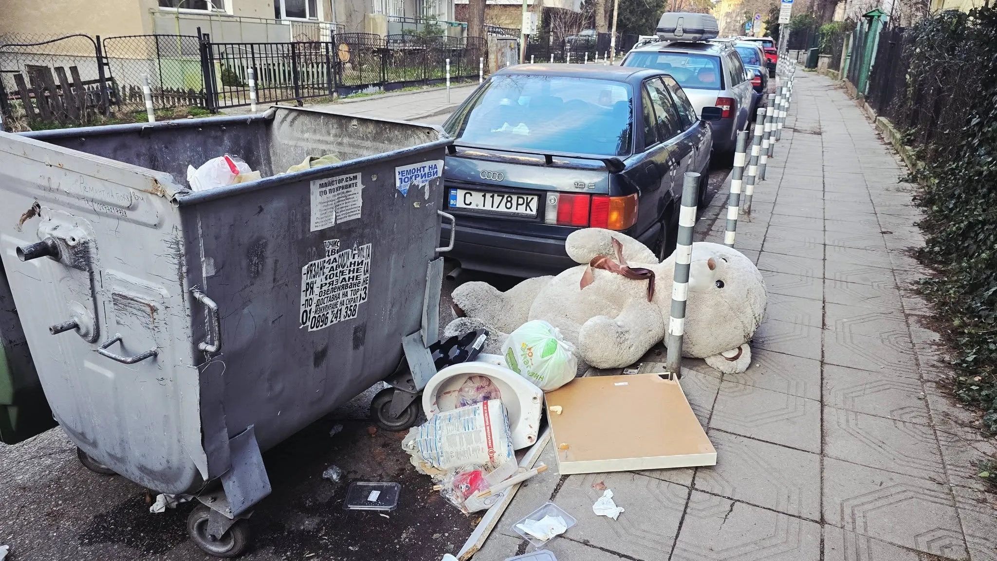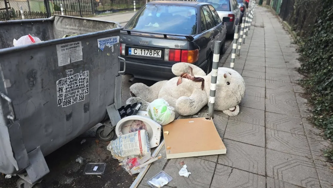 В столичния квартал Лозенец минувачи станаха свидетели на една модерна градска драма – огромно плюшено мече, изоставено до контейнер за боклук. До него – тоалетна чиния. Символиката е толкова силна, че дори Фройд би си взел бележник.