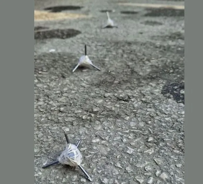 Валентин Пенчев споделя и снимки на въпросните приспособления. Става въпрос за няколко пирончета, скрепени заедно. Те някак са се озовали на оживената паркинг площ на хранителен магазин, намиращ се в „Тракия“.