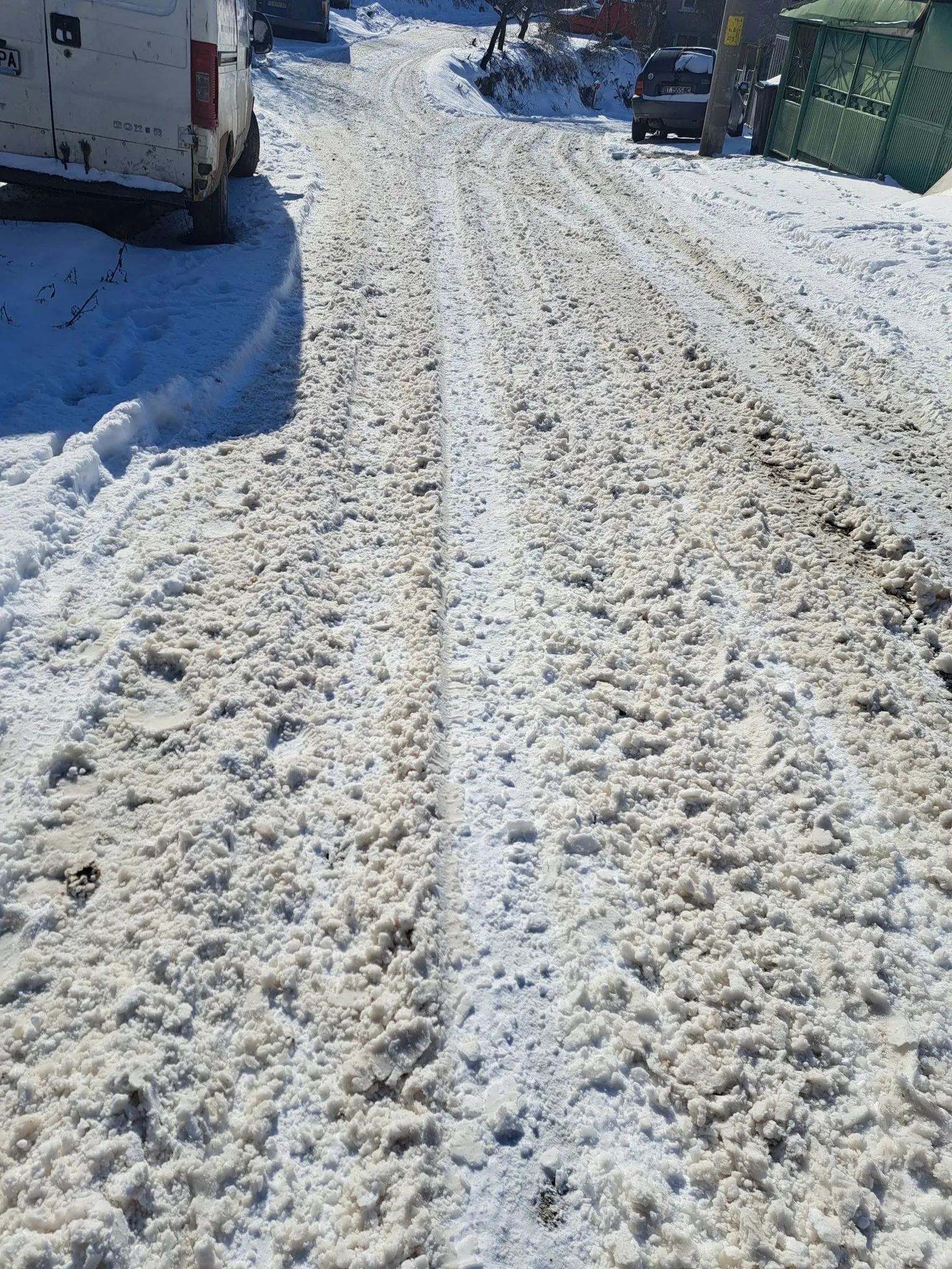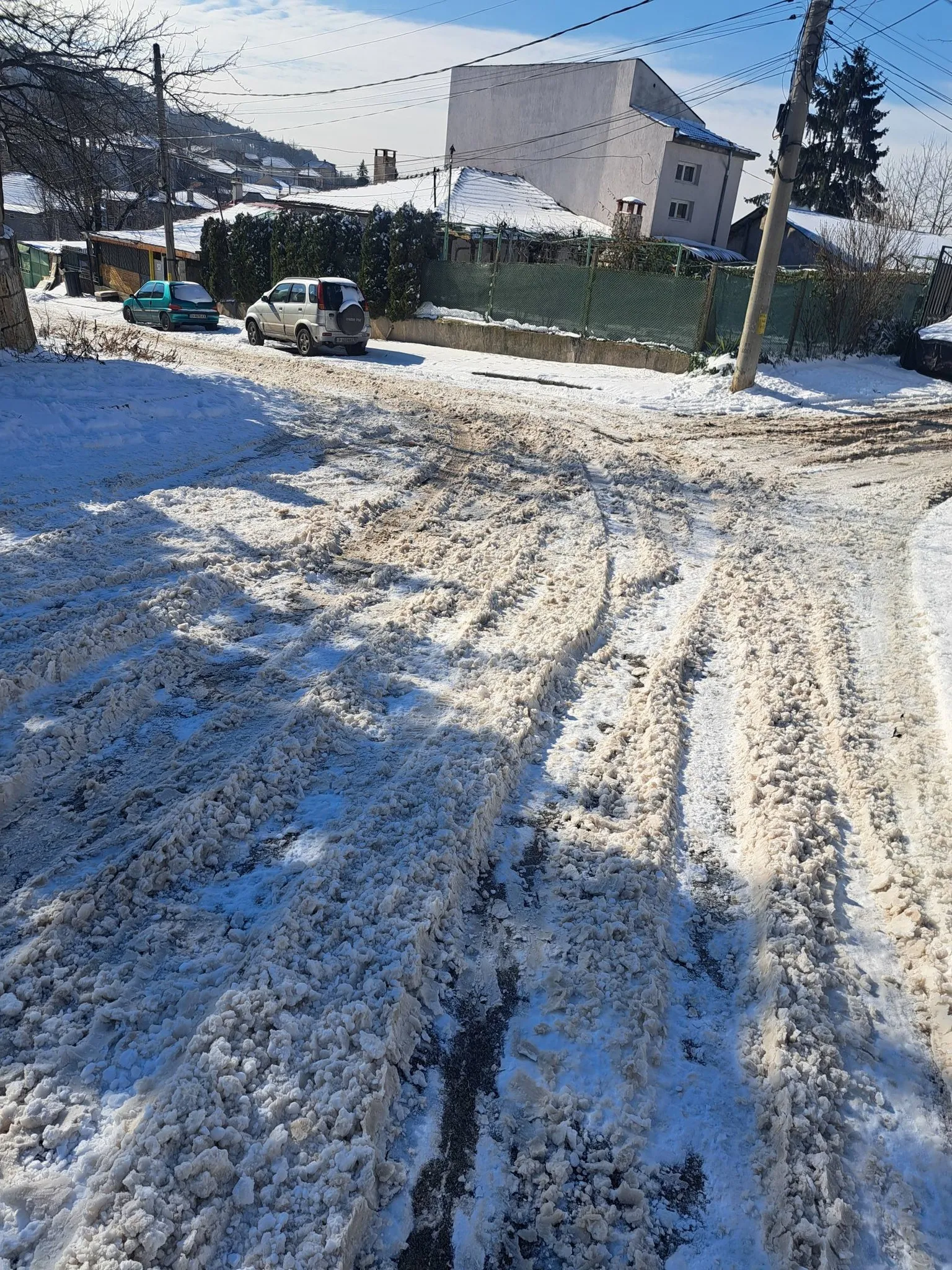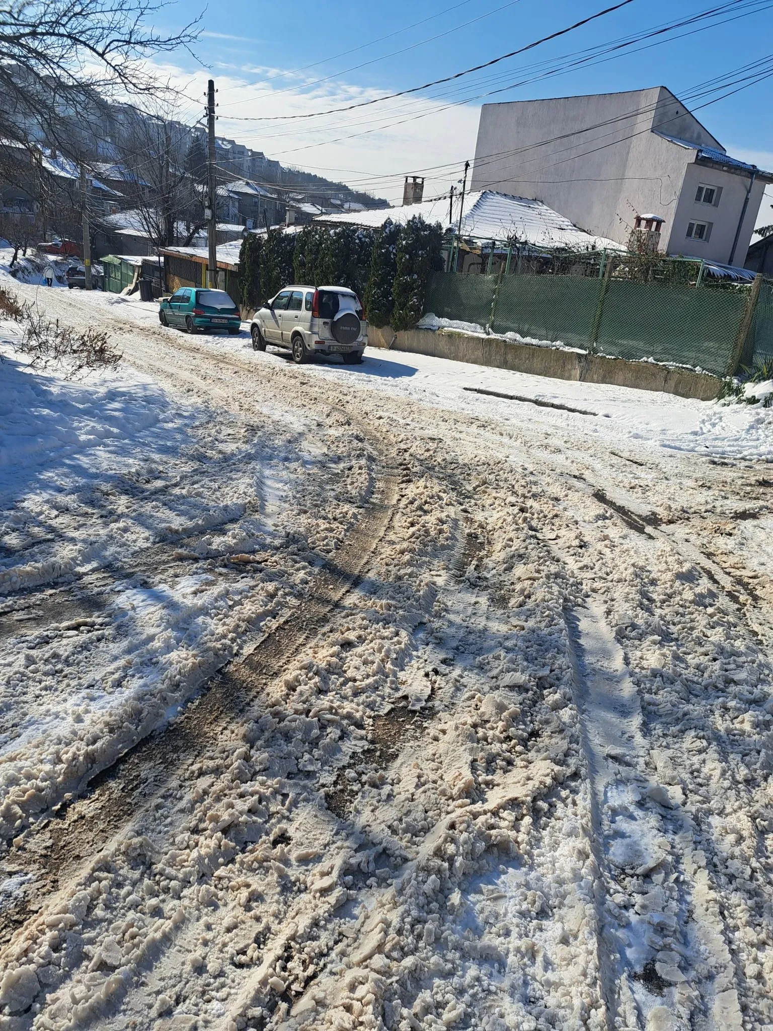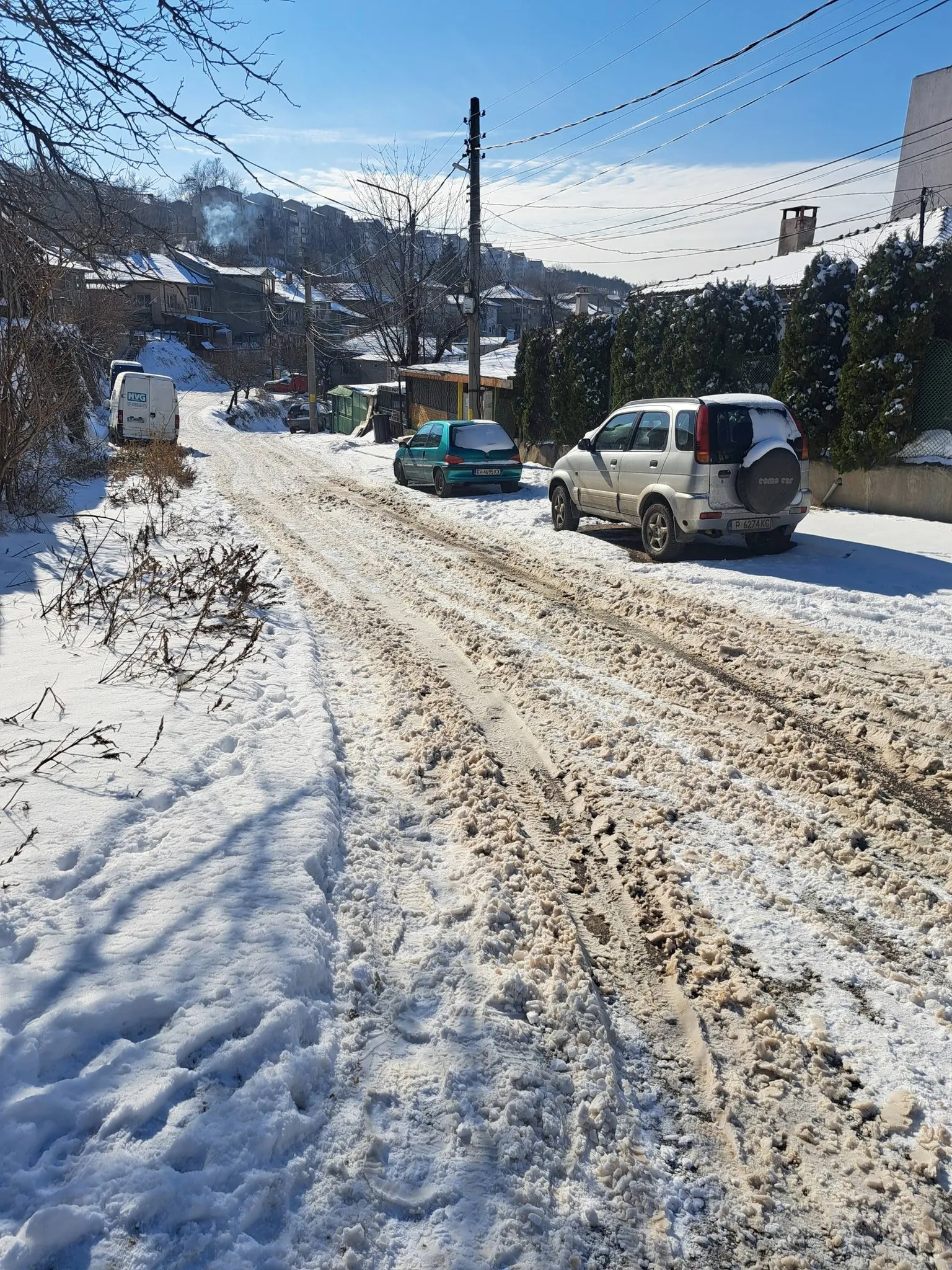От снимките се вижда улица, покрита със сняг и киша, с дълбоки коловози и силно хлъзгава повърхност. По стръмния участък автомобилите се движат трудно, а за пешеходците преминаването изглежда почти невъзможно без риск от подхлъзване и падане.