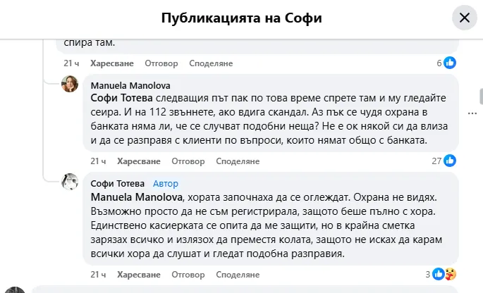 Случаят предизвика оживена дискусия в социалната мрежа. В коментарите под поста Мануела Манолова посочи: „Ако няма знак, който да забранява да сте там, въобще не се връзвайте на такива. Буквално не мога да си представя как някой ще ме изкара от банката, защото си е заплюл някакво място за негово“. Тотева отговори: „Изкара ме. Повиши ми тон и станаха голяма разправия. Неудобно ми стана от всички служители и клиенти на банката. Помислих дори, че наистина явно нещо съм пропуснала и нямаме право вече да се спира там“.