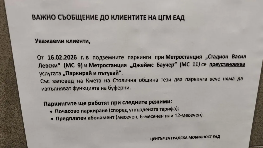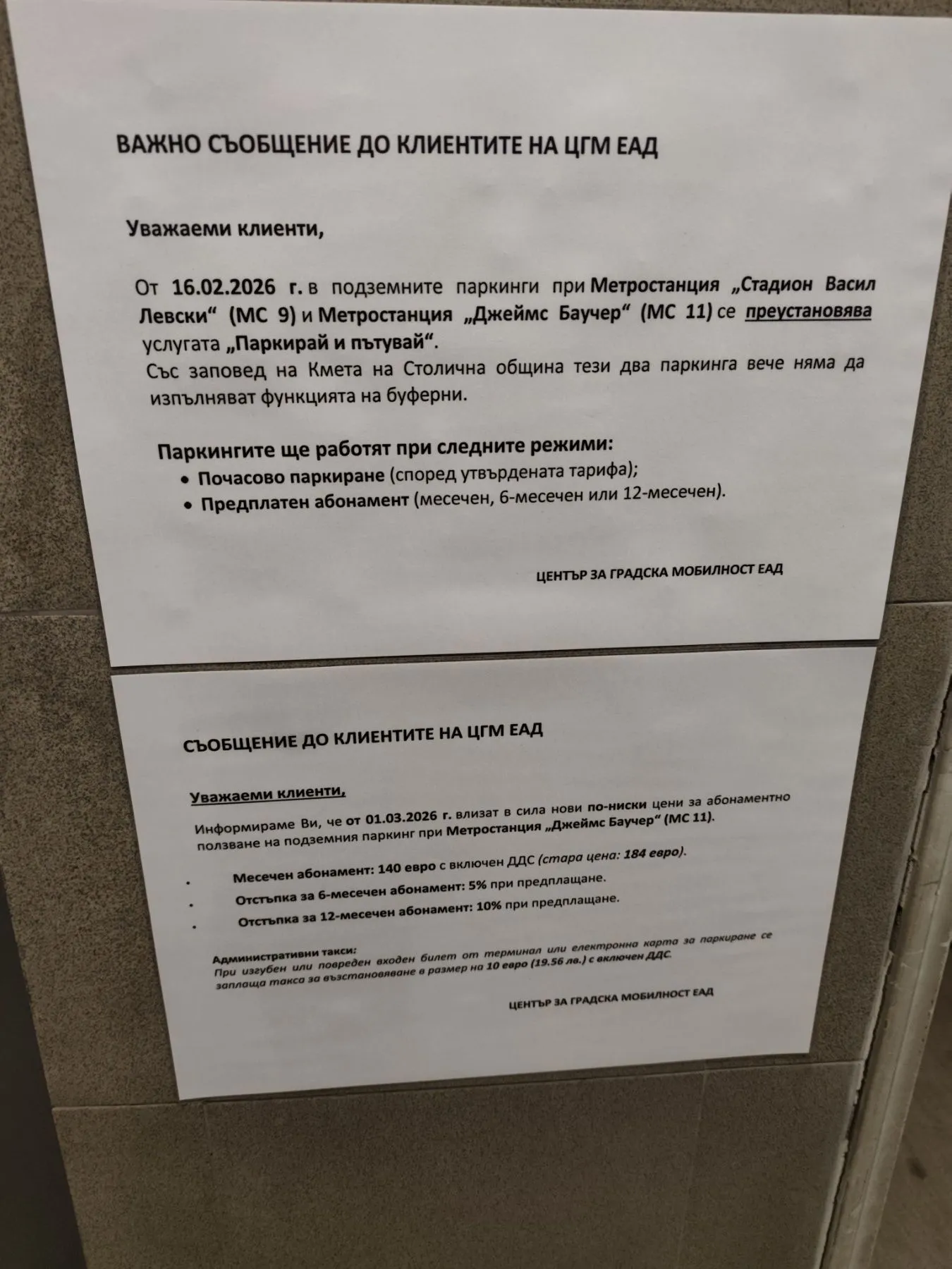 Два от паркингите към метрото в София, които можеше да се ползват безплатно или на намалени цени при пътуване с градския транспорт, вече няма да предлагат тази услуга. Става въпрос за сравнително централните гаражи при стадион "Васил Левски" (193 места) и при станция "Джеймс Баучер" (577 места).