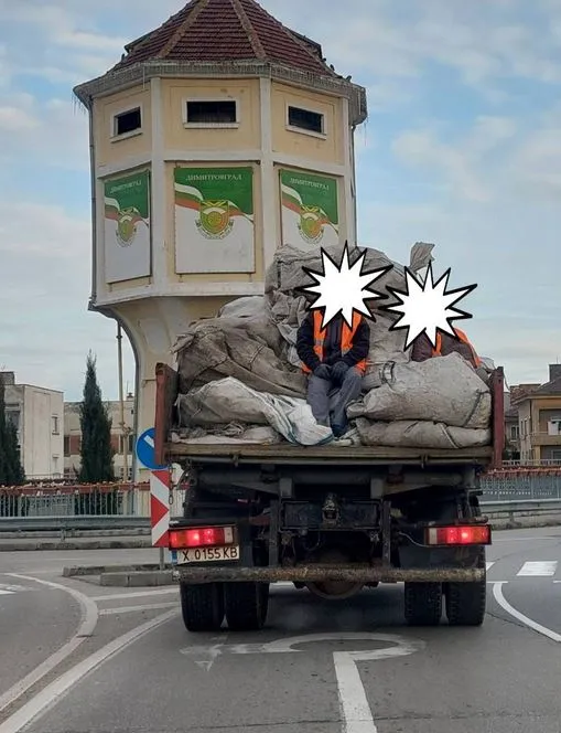 Работници в камион привлякоха вниманието на димитровградчанин. Той твърди, че мъжете са пътували в каросерията из града, като намира това за нередно и опасно. Гражданинът, който запазва анонимност, дава гласност на случката в социалните мрежи. Димитровградчанинът илюстрира сигнала си и със снимки. На тях се виждат двама мъже със светлоотразителни жилетки, които се возят в пълната каросерия на товарната машина. Той твърди, че камионът е на местна сметопочистваща фирма.