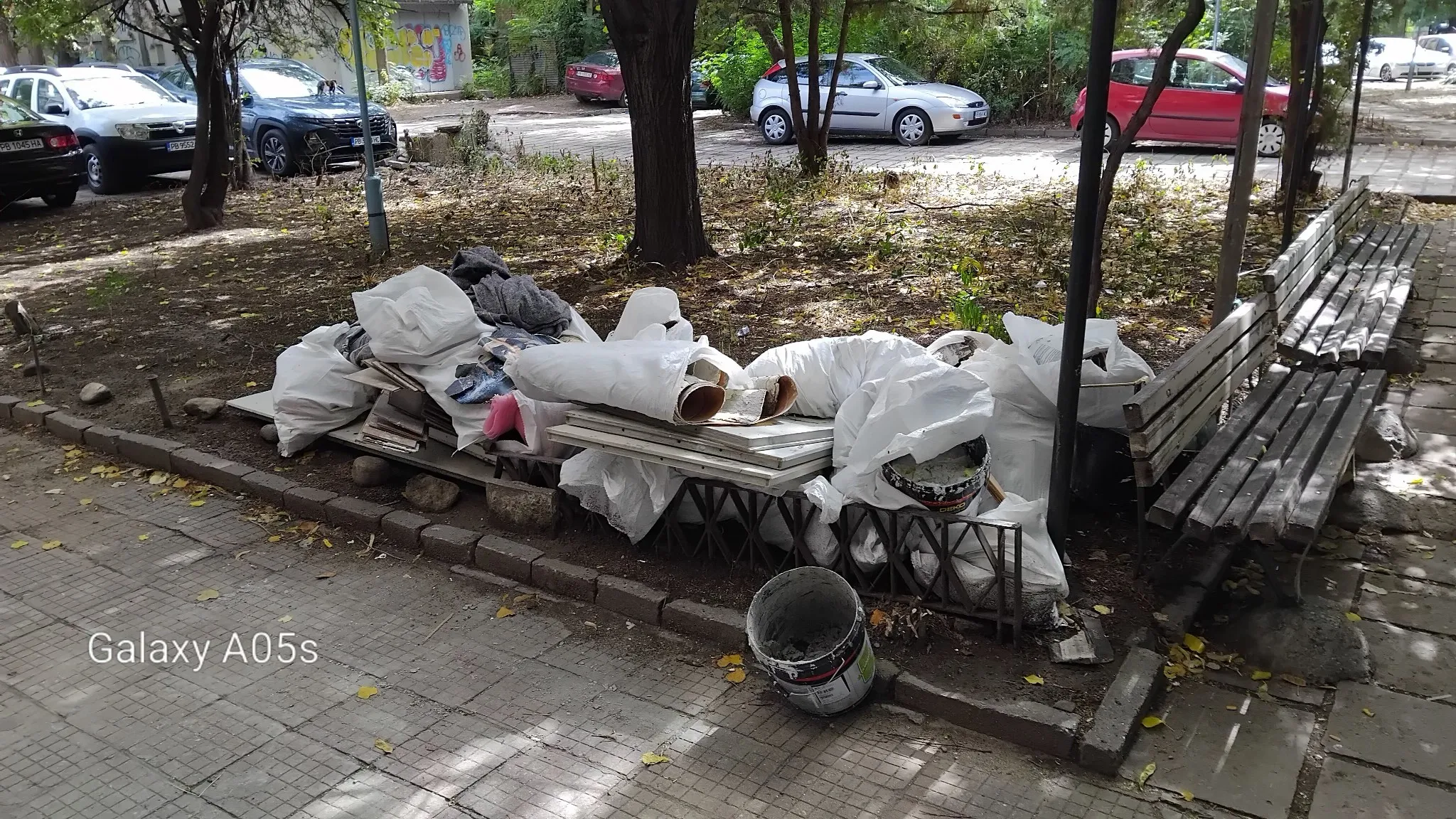 Живущи в блок в центъра на Пловдив решиха, че градинката пред входа е идеалното място за изхвърляне на торби с отпадъци, плочки, кофи с боя и каквото още е останало от домашния им ремонт. Резултатът — седмица по-късно, мястото прилича повече на строителна площадка, отколкото на междублоково пространство.