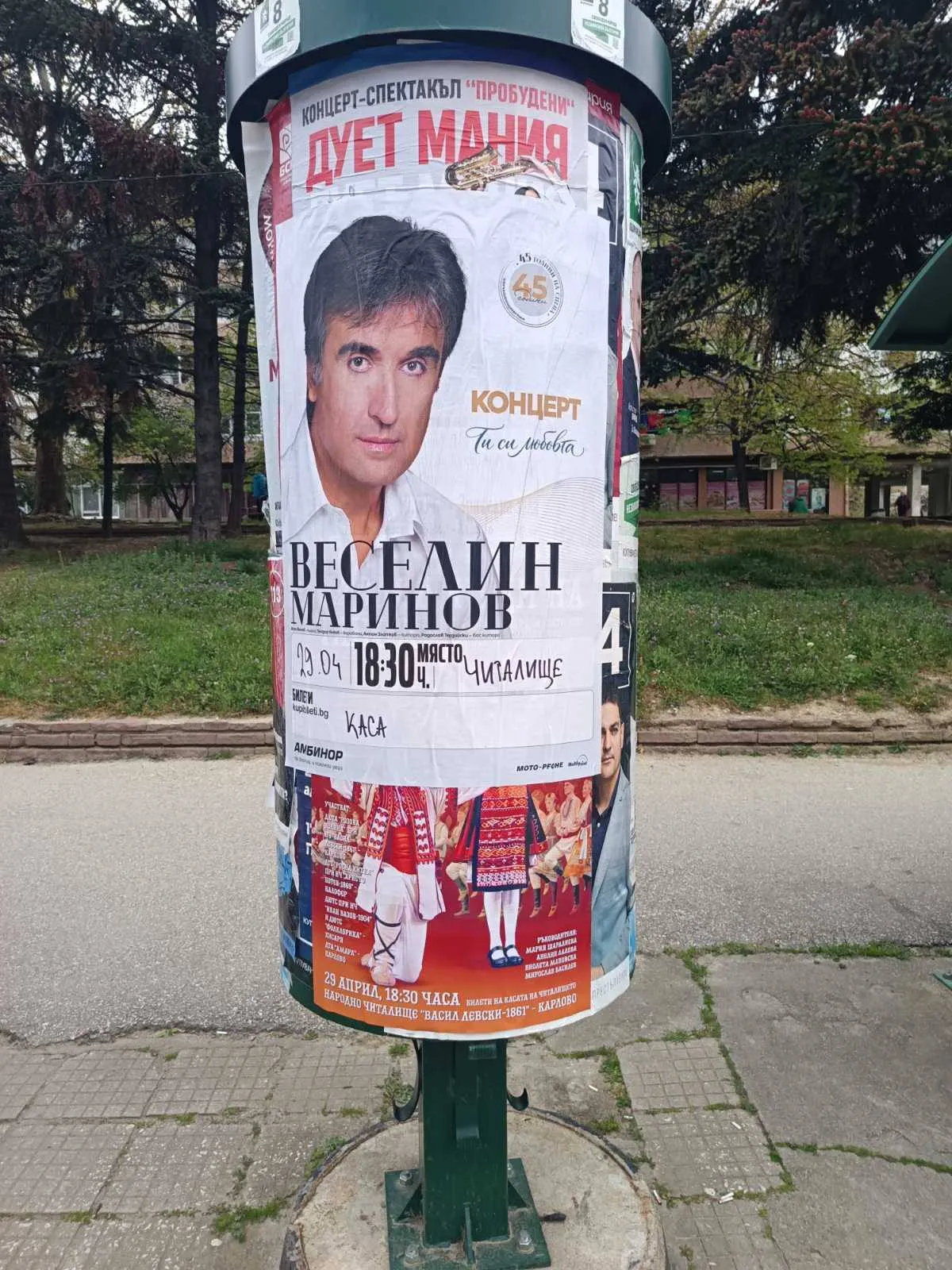От културната институция разпространиха снимки, на които се вижда как афишите на Веселин Маринов са щателно залепени върху рекламите за други концерти, намиращи се дори в „защитената“ територия на самото читалище.