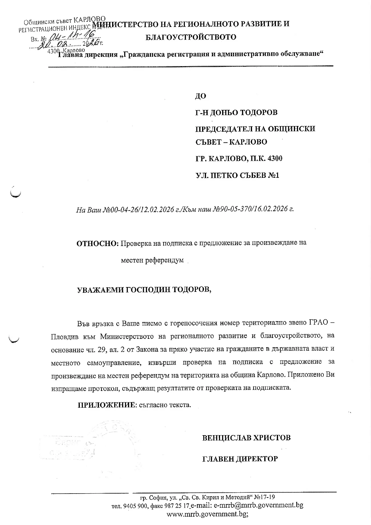 На основание на данните в писмото на ТЗ „ГРАО“ – гр. Пловдив председателят на ОС – Карлово Доньо Тодоров констатира, че броя на записите не отговаря на изискванията на чл. 27 от Закона за прякото участие на гражданите в държавната власт и местното самоуправление. Съгласно закона председателят връща на инициативния комитет подписката с указание в едномесечен срок да отстранят нередностите в нея. С писмо до кмета д-р Кабаиванов и общинските съветници Доньо Тодоров отменя насрочените заседания на комисии и сесия на Общински съвет – Карлово, на които трябваше да се обсъжда предложението за местен референдум.